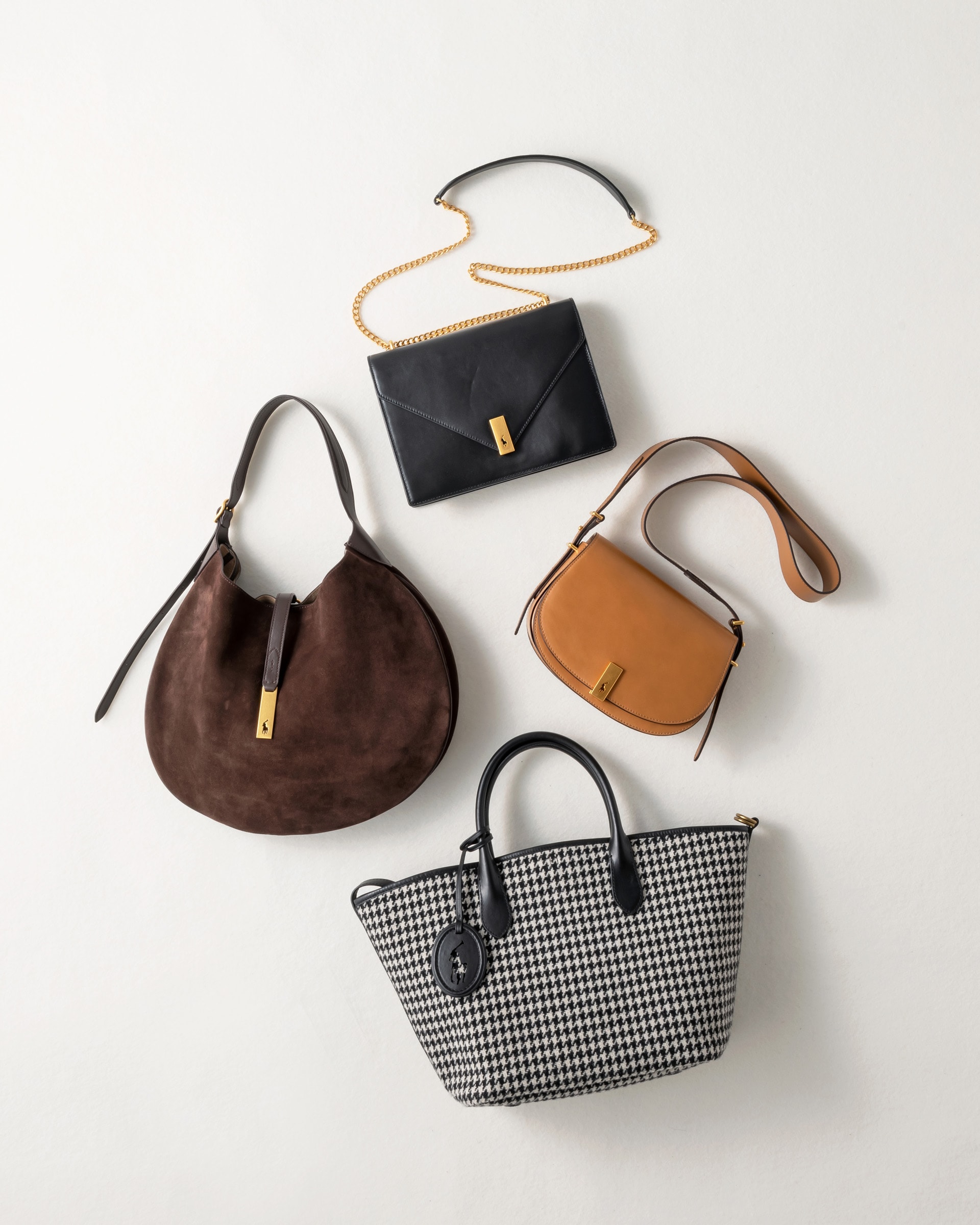 <上から時計回りに>よそ行きシーンでも活躍する、ゴールドチェーンがリッチにきらめくスクエアフォルム。バッグ〈H19.5×W27×D4cm〉¥75,900、丸みのある上品なサドルシルエットは、平日のきちんとコーデにも週末のカジュアルコーデにもお似合い。バッグ〈H16×W23.5×D6.5cm〉¥86,900、クラシカルな千鳥格子柄でトートバッグも大人顔。ノートPCやタブレットが入るうれしいサイズ感。バッグ〈H28.5×W50.5×D16.5cm〉¥86,900、ワンハンドルでスマートに持てるスエードバッグ。中は2つのコンパートメントで収納力抜群。バッグ〈H31×W39.5×D4cm〉¥97,900(全てポロ ラルフ ローレン/ラルフ ローレン)