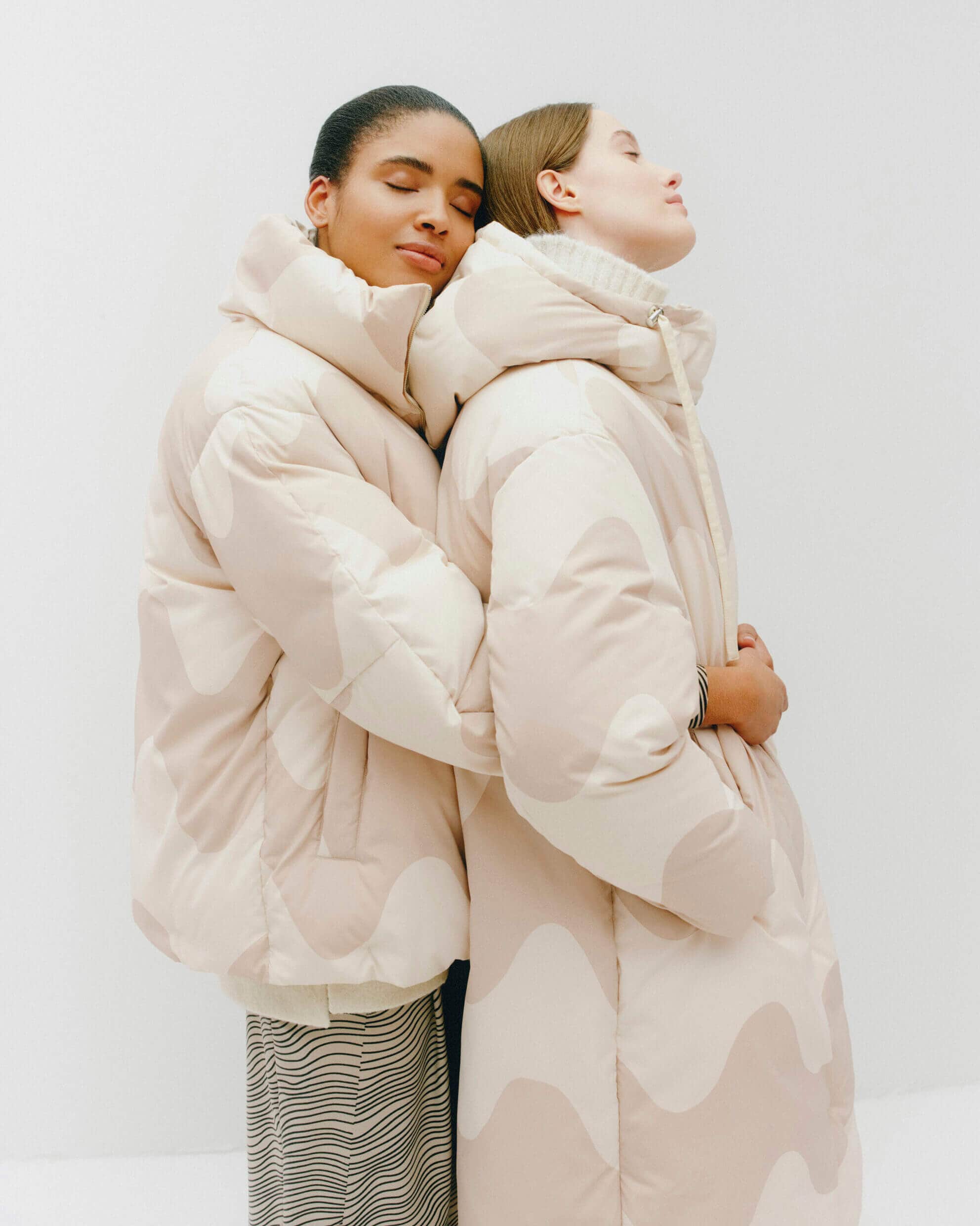 長年愛され続けているロッキ(Lokki/カモメ)柄を採用した、柔らかな配色のベージュ×オフホワイトのダウンコートは。思わず抱きしめたくなるようなふわふわの着心地です。ピローのようにソフトな着心地と暖かさを叶えます。表地と裏地にリサイクルポリエステルを使用。