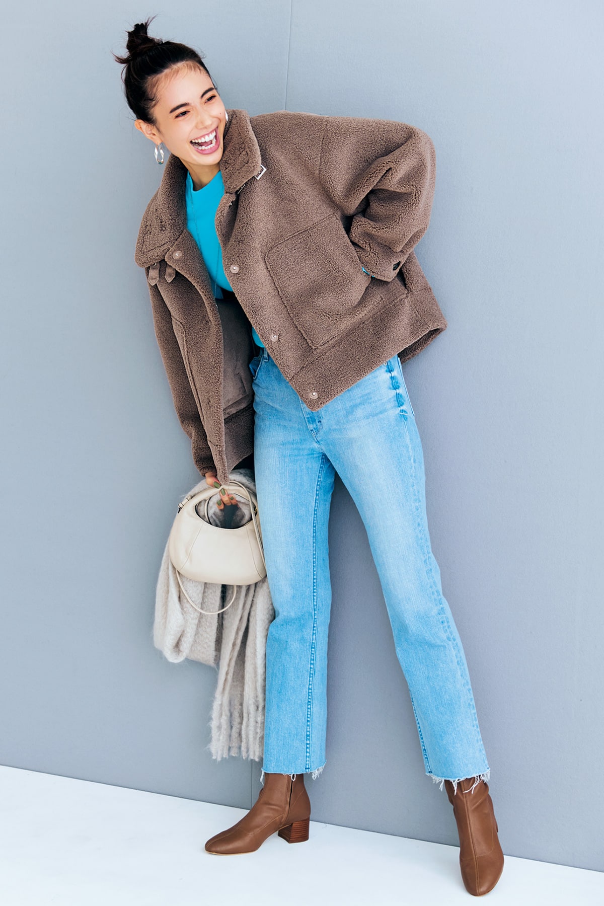 衿を立てるとスタンドカラーになり、真冬はマフラー要らず。もっちりした上質なエコムートンの素材感、そして魅力的なプライスもあって、毎年問い合わせが殺到!ジャケット¥35,200(スタニングルアー/スタニングルアー新宿店)ニット¥14,300(アダム エ ロペ)デニムパンツ¥27,500(ヤヌーク/カイタックインターナショナル)バッグ¥29,700(オルセット/オルサ)ストール¥29,700(トラディショナル ウェザーウェア/トラディショナル ウェザーウェア ルミネ有楽町店)ブーツ¥73,700(アイシクル/アイシクル 伊勢丹新宿店)ピアス¥15,290(パズコレクティブ/ ZUTTOHOLIC)ネックレス¥10,450(イン ムード/フォーティーン ショールーム)