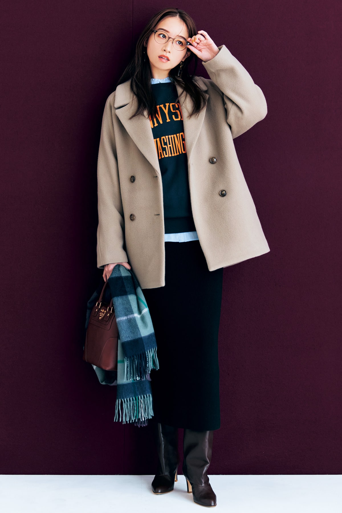 ムードのある色選びが得意なバビロン。カジュアルを格上げするニュアンスカラーは、羽織るだけで洒落っ気たっぷり。コート¥56,100(バビロン/エレメントルール カスタマーサービス)スウェット¥6,050(チャンピオン/ヘインズブランズ ジャパン カスタマーセンター)ブラウス¥4,850(ビューティ&ユース/ビューティ&ユース ユナイテッドアローズ 丸の内店)スカート¥28,600[予定価格](アイリス&インク/THE OUTNETカスタマーケア)バッグ¥53,900(アタオ/スタジオアタオ)ストール¥71,500(ジョンストンズフォー ユナイテッドアローズ/ユナイテッドアローズ 丸の内店)ブーツ¥97,900(ネブローニ/アッシュプラスエリオトロープ)メガネ¥19,800(FURLA/デリーゴジャパン)イヤリング¥9,720(アビステ)