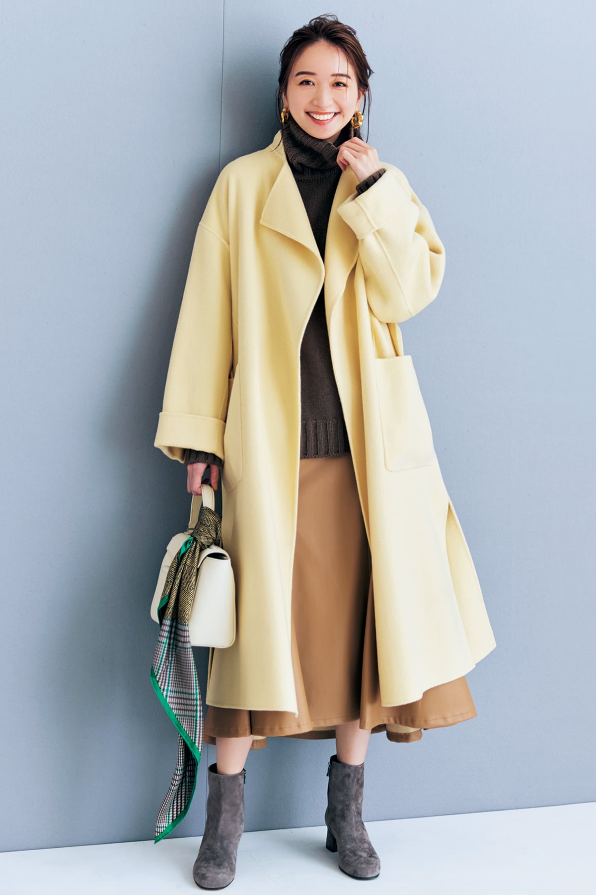 大きめな衿と袖の折り返しデザインがポイントのコートは、今年は身幅と着丈を少しコンパクトに設定。大人に似合うようにすべてオリジナルで染めているそう。コート[ベルト付き]¥42,900(アンクレイヴ ホワイト/アンクレイヴ)ニット¥36,300(スローン)スカート¥24,200(エストネーション)バッグ¥52,800(ヴァジック/ヴァジックジャパン)スカーフ¥17,600(マニプリ)ブーツ¥41,800(ギャルリー・ヴィー/ギャルリー・ヴィー 丸の内店)ピアス¥35,970(ジョアンナ ローラ コンスタンティン/ZUTTOHOLIC)