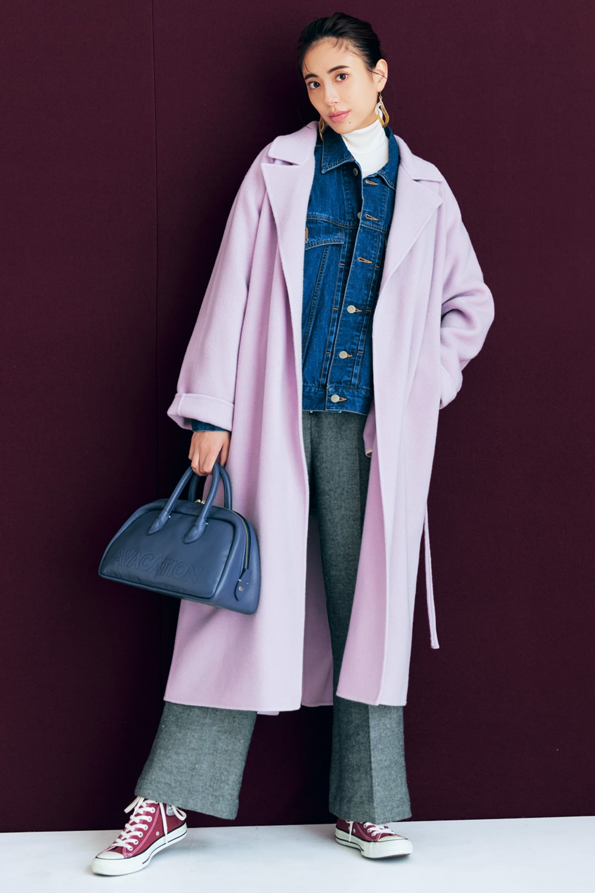 7色展開と豊富なカラーバリエーション、そして何と言ってもストレスフリーな軽さが魅力。撥水仕上げによって、どんな天候にも対応できるのが心強い。コート[ベルト付き]¥31,900(ノーク/クロスプラス)Gジャン¥40,700(カレンテージ/ユナイテッドアローズ六本木ヒルズ店)ニット¥30,800(スローン)パンツ¥17,600(エミ/エミ ニュウマン新宿店)バッグ¥51,700(ア ヴァケーション/ノーベルバ)スニーカー¥6,380(コンバース/コンバースインフォメーションセンター)ピアス¥5,400(アビステ)