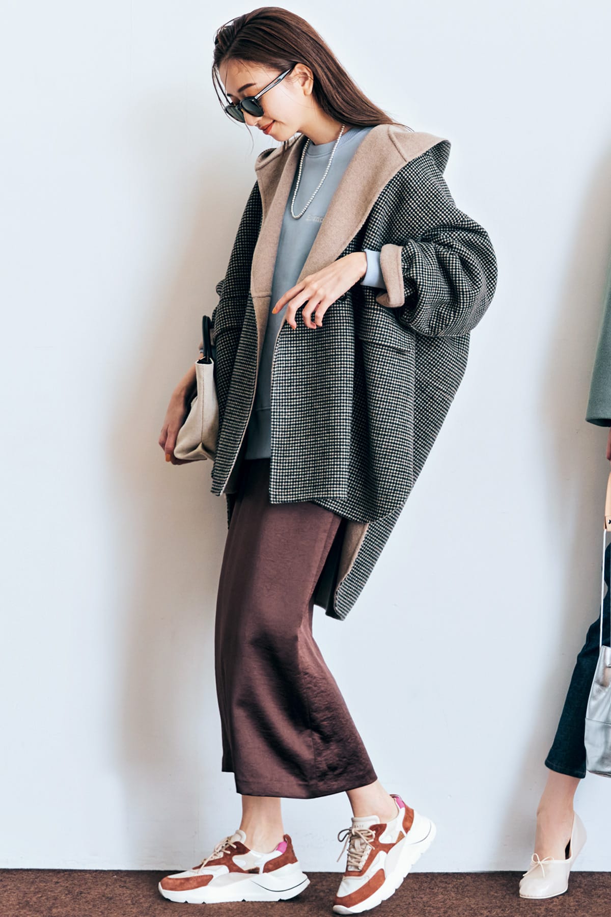リサイクルウールを使用したダブルフェイスコート。お尻がしっかり隠れる、ルーズなポンチョ型が新鮮!コート¥17,930(シップス エニィ/シップス インフォメーションセンター)スウェット¥13,200(LES PETITS BASICS/スピック&スパン ルミネ有楽町店)スカート¥14,300(LILY BROWN/LILY BROWN ルミネエスト新宿店)バッグ¥52,800(ヘリュー/ショールーム セッション)スニーカー¥36,300(デイト/ティースクエア プレスルーム)サングラス¥45,760(オリバーピープルズ/ルックスオティカジャパン カスタマーサービス)ネックレス¥39,380(アルポ/ZUTTOHOLIC)