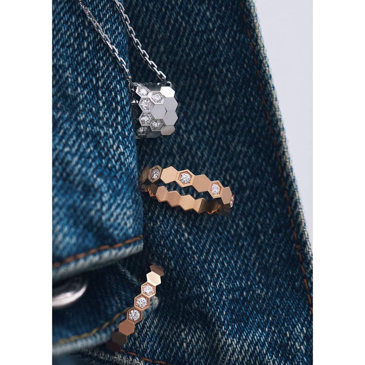 同じシリーズで地金を変えたミックス&マッチもおすすめ。上から・「ビーマイ ラブ」コレクション ハニカムペンダント〈WG×D〉¥771,100 ハニカムダイヤリング中・〈PG×D〉¥454,300下・〈PG×D〉¥313,500(すべてショーメ)デニムジャケット¥41,800(ハイク/ボウルズ)