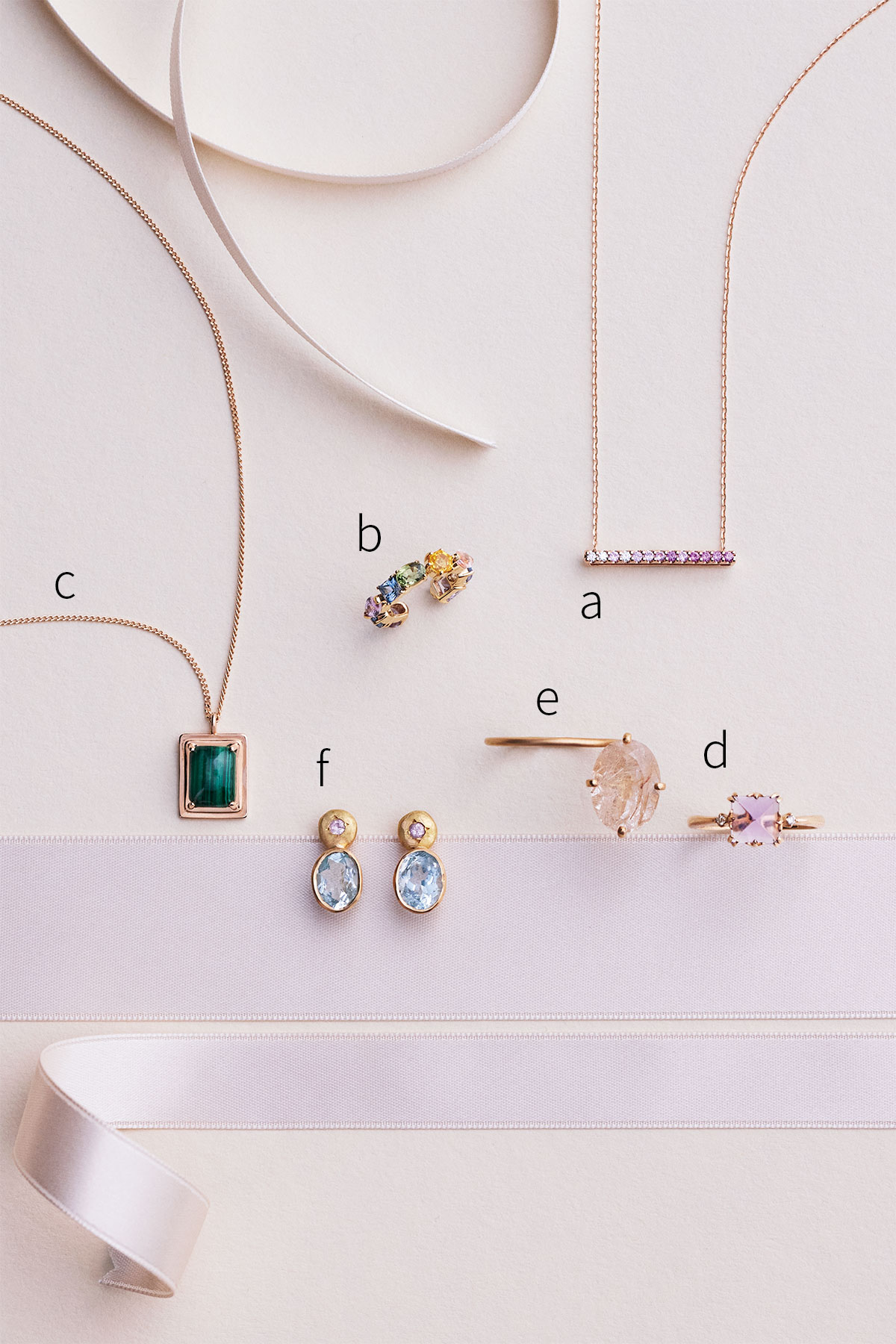 a. トップの取り外しが可能で、横・縦ラインの2wayで楽しめます。ネックレス〈PG×ピンクサファイア×D〉¥93,500(ポンテヴェキオ/ポンテヴェキオ 銀座並木通り本店)b. 遊び心のあるデザインこそ本物を。色とりどりのサファイアにときめきをもらって。イヤーカフ〈YG×カラーサファイア〉¥77,000(シンティランテビス/イセタン サローネ東京ミッドタウン)c. 深みのあるグリーンと、独特な縞模様が目を引くマラカイト。ネックレス〈YG×マラカイト〉¥59,400(ココシュニック)d. 甘やかなアメシストも、シャープなフォルムでちょうど良いバランスに。リング〈YG×アメシスト×D〉¥35,200(ノコン/中込宝飾)e. 指からこぼれ落ちそうなストーンに心奪われる、これまでにない新鮮なリング。リング〈YG×ルチルクオーツ〉¥88,000(トーカティブ/トーカティブ 表参道)f. 透明感のある色石を用いた、アンティークジュエリーのような高貴な佇まい。ピアス〈YG×アクアマリン×サファイア〉¥99,000(in unam)