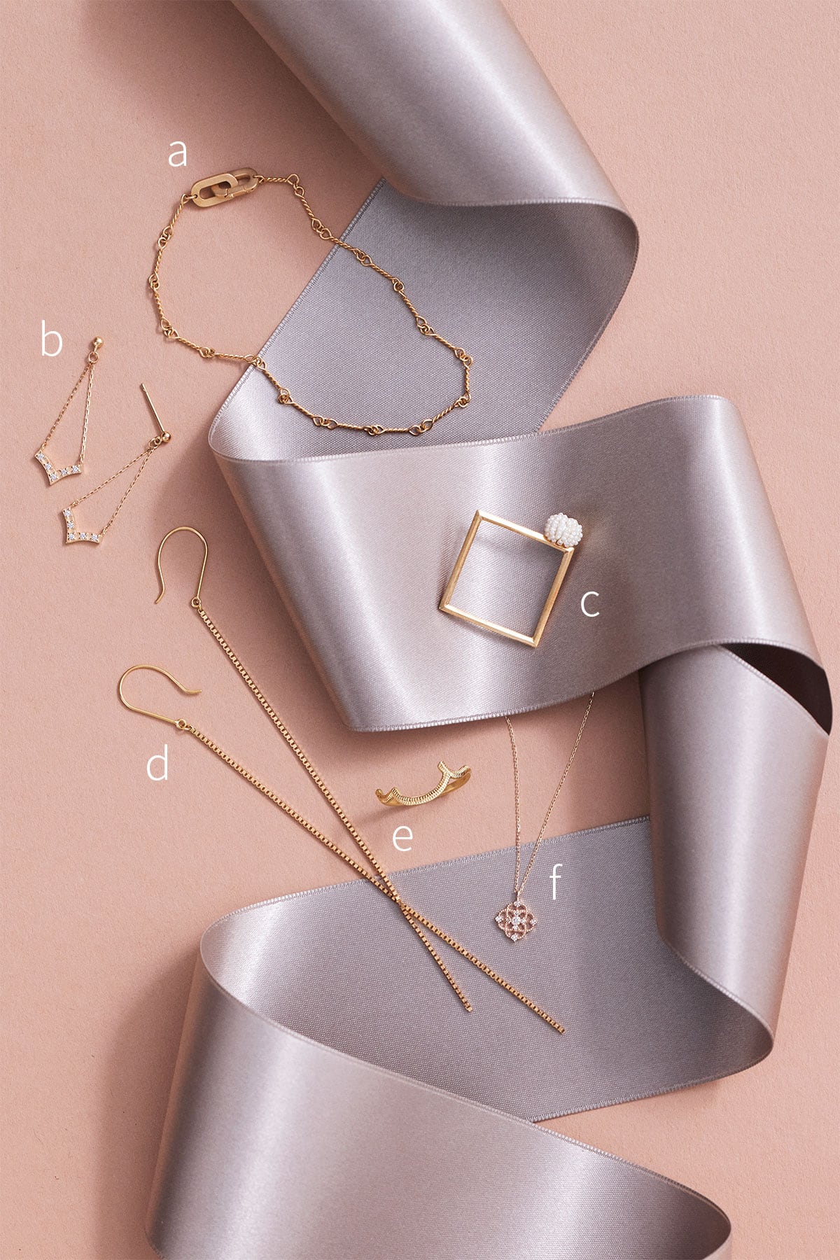 a 捻りや繋ぎといった緻密なディテール、開閉部分が内蔵された作りなど、ミニマルな中に光る職人技に心動かされて。ブレスレット〈YG〉¥99,000(トーカティブ/トーカティブ 表参道)b 5石ずつあしらわれたダイヤモンドが、耳元で上品に煌めきます。ピアス〈YG×D〉¥59,400(ヴァンドーム青山/ヴァンドーム青山 プルミエール 伊勢丹新宿店)c 小粒のパールから成る鞠のような球体を、市松模様にのせた和モダンな世界観。リング〈YG×シードパール〉¥69,300(チェリーブラウン)d 削ぎ落とされたディテールに宿る、洗練された女性像。ピアス〈YG〉¥57,200(ジジ/ホワイトオフィス)e 雲のような輪郭に、彫りがもたらす煌めきと立体感。リング〈YG〉¥61,600(ギクラ/drama H.P.FRANCE 伊勢丹新宿店)f フラワーモチーフを、透かし模様に落とし込んだネックレス。ヴィンテージ調の風合いも魅力的に映ります。ネックレス〈YG×D〉¥33,000(EAU DOUCE 4℃/エフ・ディ・シィ・プロダクツ)