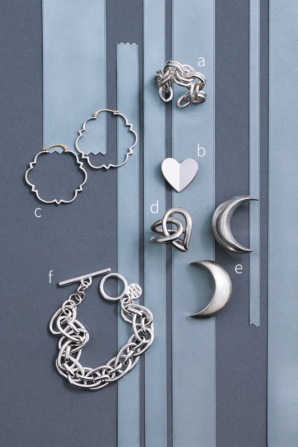 a 装いの完成度を引き上げるコンテンポラリーなムード。イヤーカフ〈SV〉¥49,500(ラッツェル アンド ウォルフ/ザ・ウォール ショールーム)b ほんのりエッジィな雰囲気を持ち合わせたハートモチーフ。適度なサイズ感のパールキャッチもセット。ピアス〈SV×パール〉¥18,700(マユ/drama H.P.FRANCE 伊勢丹新宿店)c 地金のみのシンプルなデザインで、フラワーモチーフも甘すぎないのが気分。ピアス〈SV×YG〉¥19,800(カオル/カオル 伊勢丹新宿本店)d まるで彫刻のようなシェイプの美しいアートピース。リング〈SV〉¥86,000(シャルロット シェネ/エドストローム オフィス) e 愛らしいモチーフもソリッドに仕上げて印象的に。ピアス〈SV〉¥82,500(ソフィー ブハイ/エスケーパーズオンライン)f これをひとつ+1するだけで、装いの方向性が決まる。ニットやシャツの上から着けるのも今年らしい。ブレスレット〈SV〉¥14,300(フィリップ オーディベール/TOMORROWLAND)