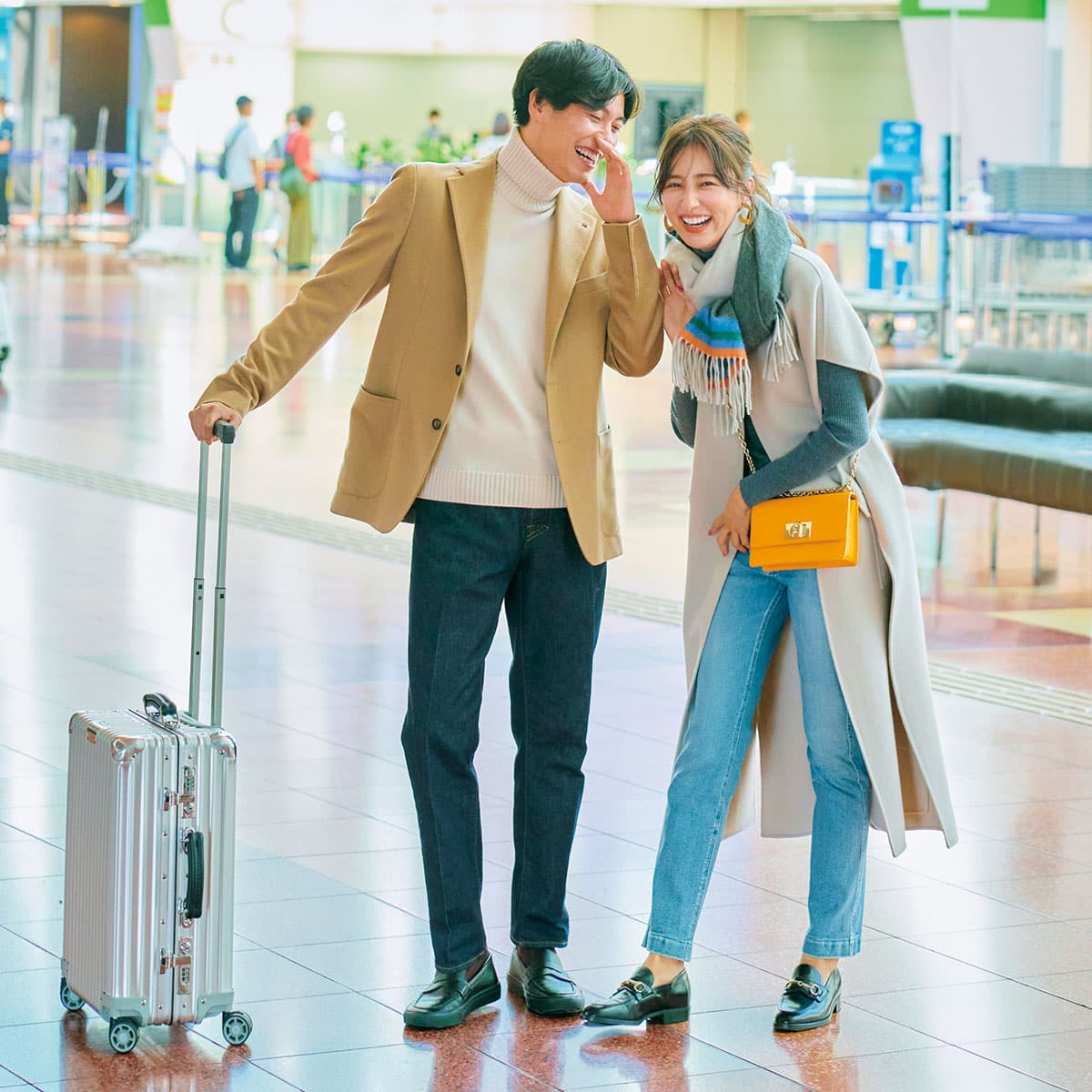 端正なフォルムだから派手色でも上品な印象。内側はベージュの柔らかなスウェード素材。細い部分は程よくフィットするテーパードデニムがリラックス感と美脚を両立。バッグ[H13.5×W20×D7]¥55,000(FURLA/FURLA JAPAN)パンツ¥23,500(SERGE de bleu/ショールーム セッシ ョン)ニット¥26,400(スローン)ジレ¥74,800(LE PHIL/LE PHIL NEWoMan 新宿店)ストール¥88,000(ベグ アンド コー/ボーダレス)シューズ¥35,200(ルカ グロッシ/WASH ルミネ横浜店)イヤリング¥9,900(エネーダ/ココシュニック オンキッチュ 有楽町マルイ店)〈男性〉ジャケット¥154,000〈タリアトーレ〉ニット¥35,200〈ドゥルモア〉パンツ¥28,600〈イカイ〉(すべてビームスF)スーツケース¥183,700(リモワ/リモワ クライアントサービス)