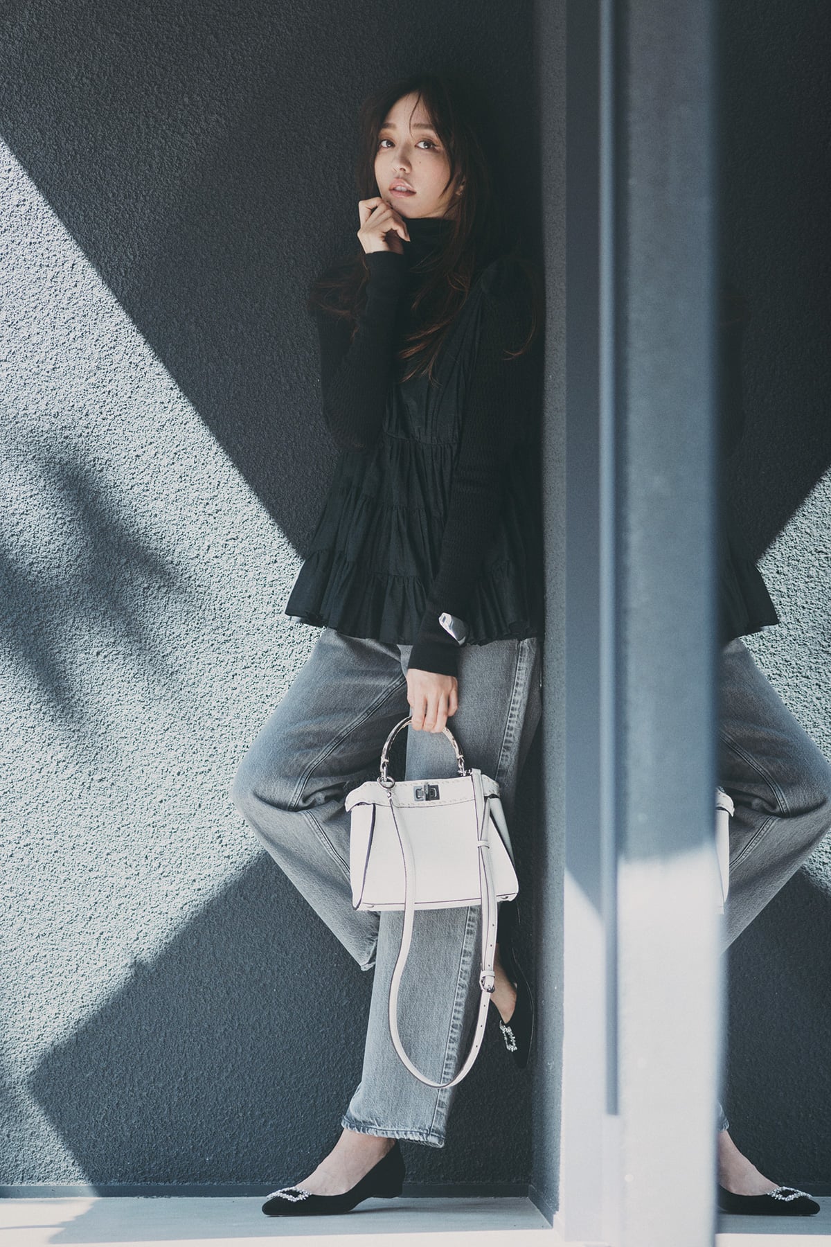 〝いないいないばあ〟を意味する名を冠したバッグ。ユニークでクリエイティブな精神と唯一無二の職人技術が詰まったバッグはまさに一生モノ。バッグ「ピーカブーミニ」〈H18×W23×D11〉¥599,500(フェンディ/フェンディ ジャパン)デニムパンツ¥25,300(アッパーハイツ/ゲストリスト)ブラウス¥46,200〈マーレット〉ニット¥30,800〈ユニオンランチ〉(ともにサザビーリーグ)パンプス¥29,700(ツル バイ マリコ オイカワ)バングル¥12,650(ファシアータ/フォーティーン ショールーム)
