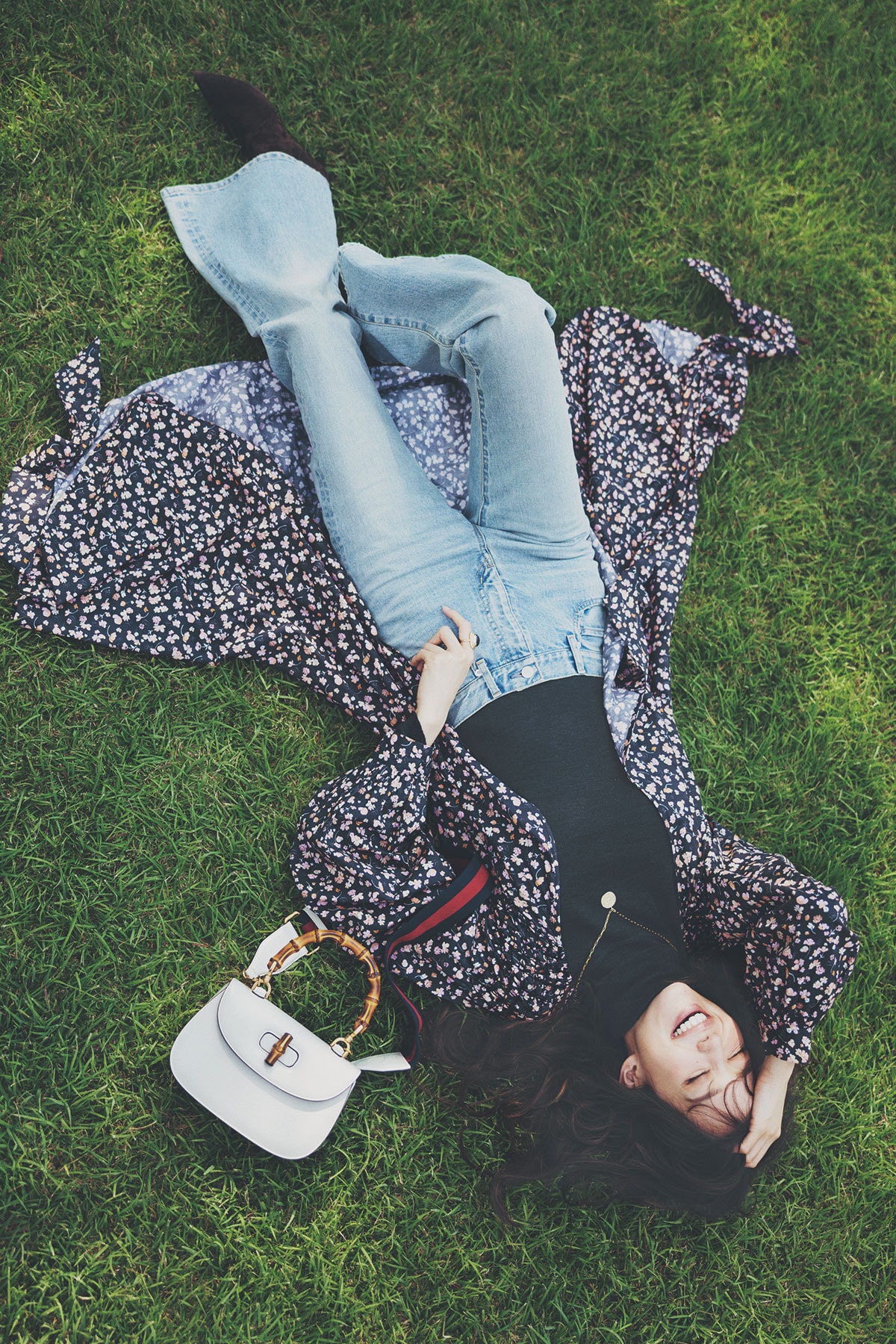 ウォッシュの利いたフレアデニムに合わせれば、旬のレトロなムードが。かつてのバンブーハンドルバッグを再解釈したデザインは、これから先の着こなしにも新たな提案をくれるはず。