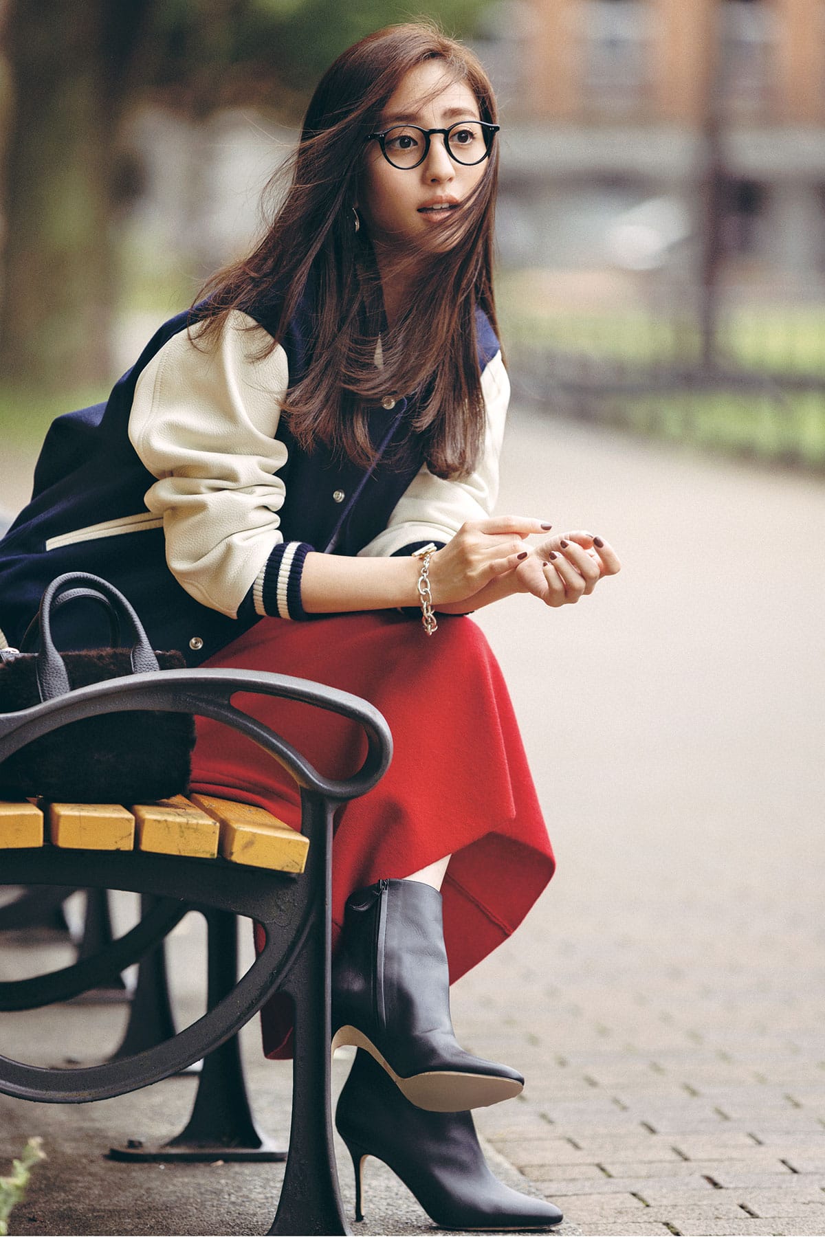 なんとなくトラッドに近づくためには、パキッとした色使いでまとめるのがコツ。差し色に最適なビビッドカラーの中でも、今季取り入れるべきはレッド。カジュアルなスタジャンに掛け合わせればインパクトも女らしさもばっちり。スカート¥50,600〈エキップモン〉シャツ¥39,600〈フランク&アイリーン〉(ともにサザビーリーグ)ジャケット¥41,800(スクーカム/アルアバイル)バッグ¥300,300(トッズ/トッズ・ジャパン)ブーツ¥171,600(マノロ ブラニク/ブルーベル・ジャパン)メガネ¥33,000(アイヴァン/アイヴァン 東京ギャラリー)ピアス¥7,150ブレスレット¥9,350(ともにイン ムード/フォーティーン ショールーム)