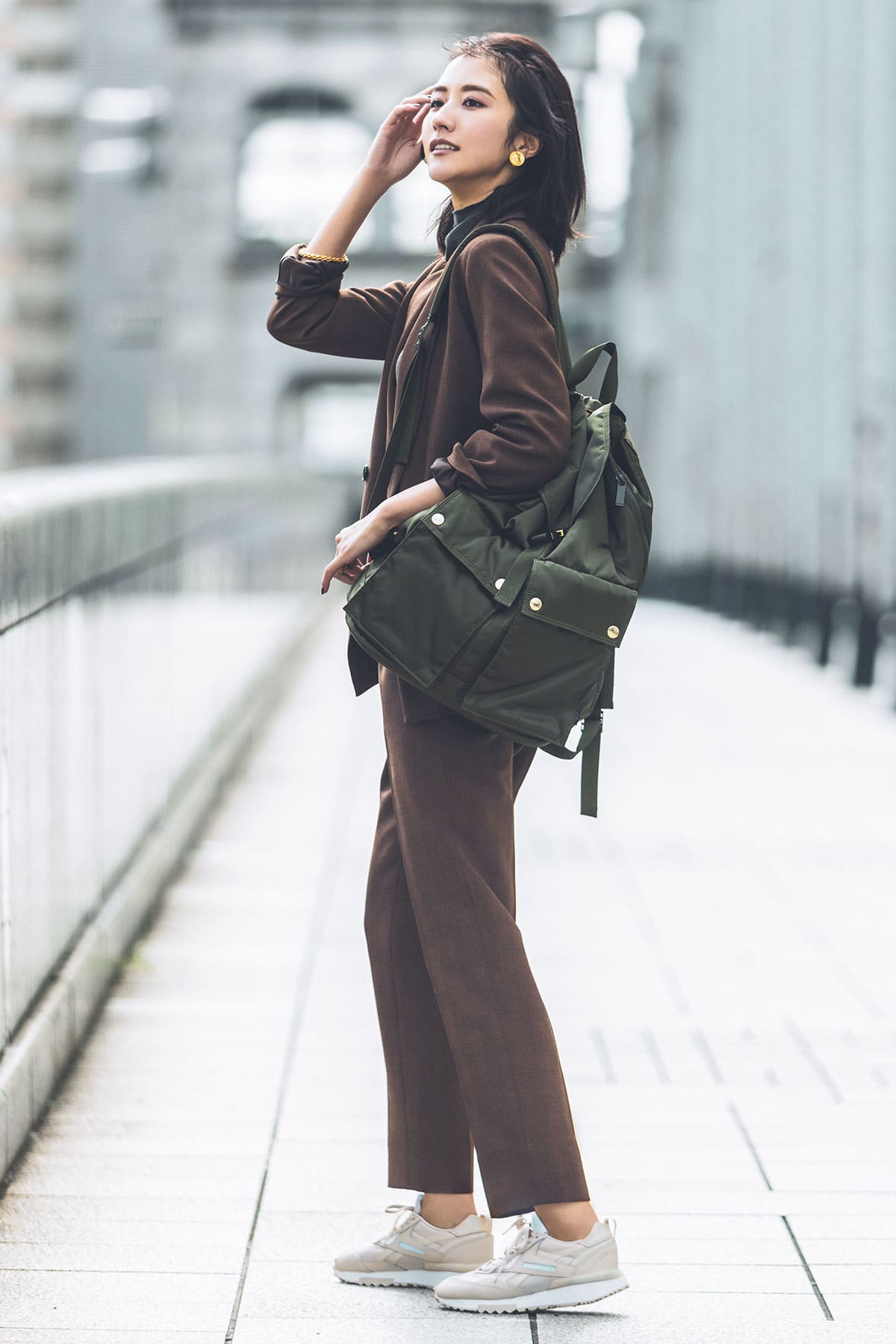 ソフトベージュにサックスブルーのロゴが優しいムード。スニーカー「LX2200」[ソール高3㎝]¥12,100(Reebok for UNITED ARROWS/ユナイテッド アローズ 渋谷スクランブルスクエア店)ジャケット¥24,200 パンツ¥14,300(ともにホワイト/ホワイト ザ・スーツカンパニー グランフロント大阪店)カットソー¥16,500(ティッカ)リュック¥64,900(マッキントッシュ×ポーター/マッキントッシュ青山店)イヤリング¥10,670(ベンアムン/ZUTTOHOLIC)ブレスレット¥5,250(アビステ)