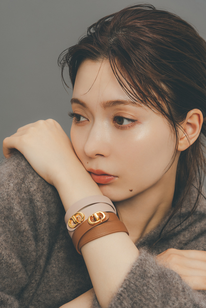 カーフスキンを使用したダブルブレスレットは、CDシグネチャーを象ったツイスト式の留め具が印象的。存在感のある佇まいが、腕を華奢に見せてくれます。どんな装いにも溶け込む柔軟さで、カジュアルなふわふわニットも上品に昇華。今回は5色のカラーバリエーションから、ブラウンの世界観にマッチするローズカラー×ブラウンの組み合わせを採用。サイズ展開もS、M、Lと豊富で、数cm違いの長さを自由に選べます。