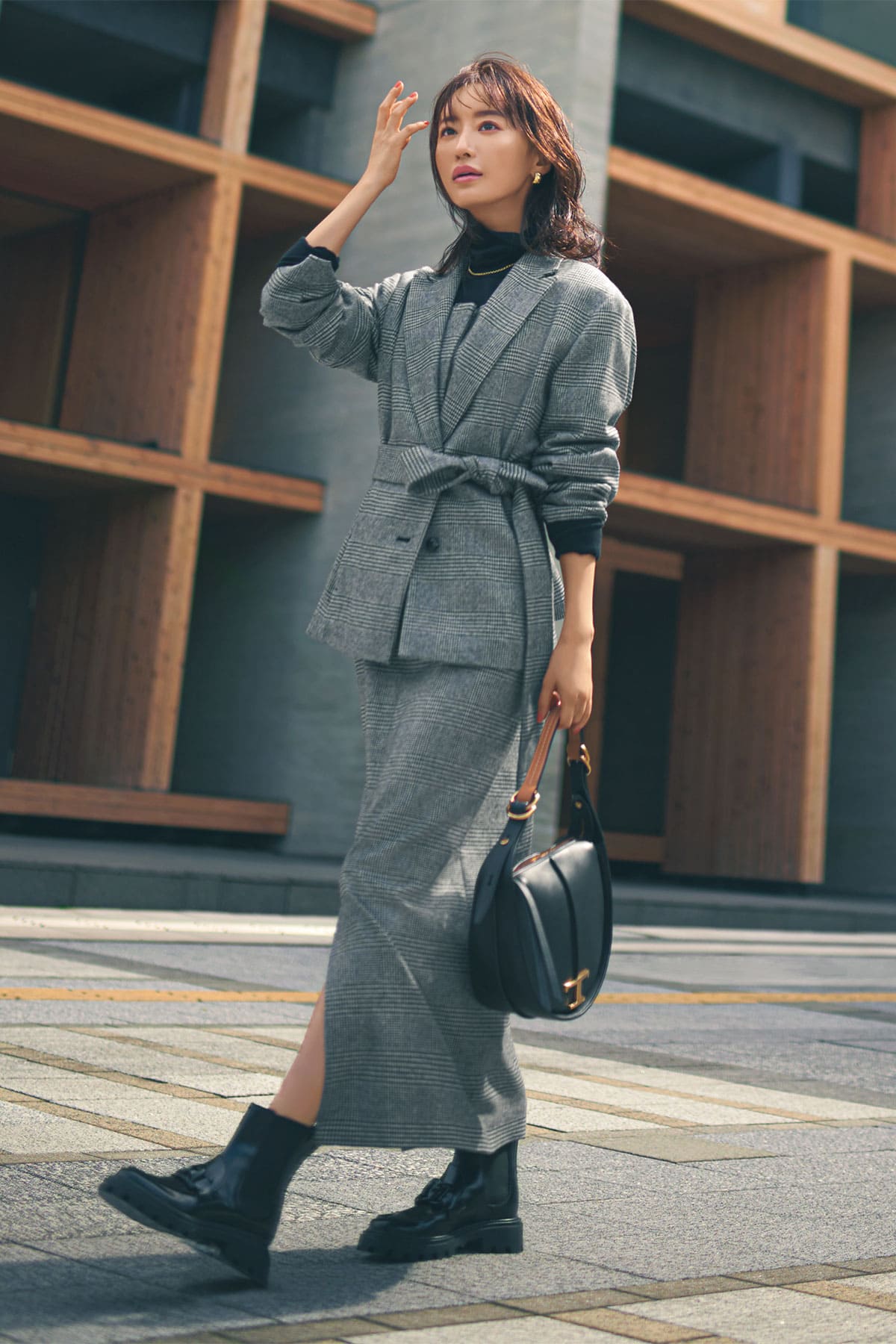 ジャケットとワンピースをセットで着てきちんと顔に。ブラックトーンでまとめたら、足元がブーツでもキレイ見えが叶います。今っぽさだけじゃなく動きやすさもばっちり。ジャケット¥61,600 ワンピース¥46,200(ともにレリタージュ マルティニーク/マルティニーク ルコント ルミネ有楽町)ニット¥36,300(スローン)ネックレス¥19,800(マリハ)ピアス¥11,000(ワンエーアールバイウノアエレ/ウノアエレ ジャパン)ブーツ¥137,500 バッグ¥277,200(ともにトッズ/トッズ・ジャパン)