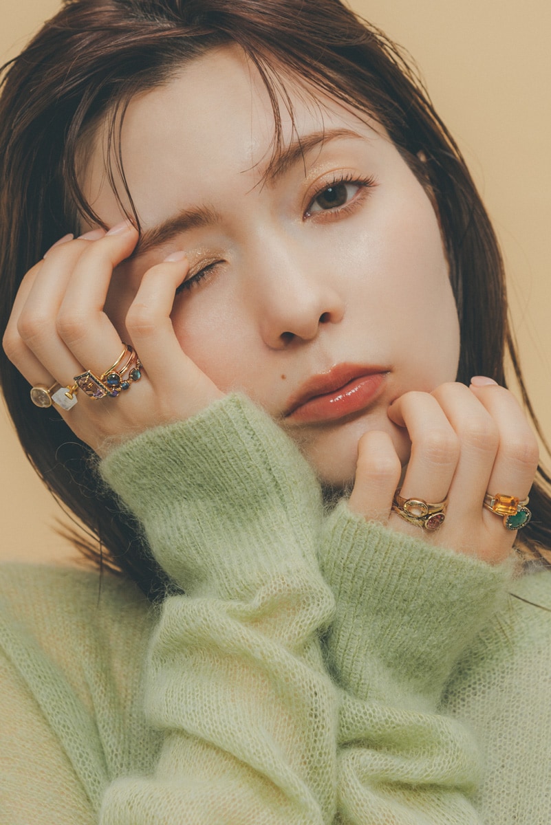 リング〈右手人差し指〉¥16,500リング〈右手中指〉¥25,300リング〈右手薬指上〉¥31,900リング〈左手人差し指上〉¥14,300リング〈左手人差し指下〉¥30,800(すべてアルティーダ ウード/THE ANOTHER MUSEUM)リング〈右手薬指中央〉¥36,300(ココシュニック)リング〈右手薬指下〉¥41,800(アガット)リング〈左手薬指上下〉各¥26,400(フォーヴィレイム/フォーヴィレイム カスタマーサポート)ニット¥13,200(ノーク/クロスプラス)
