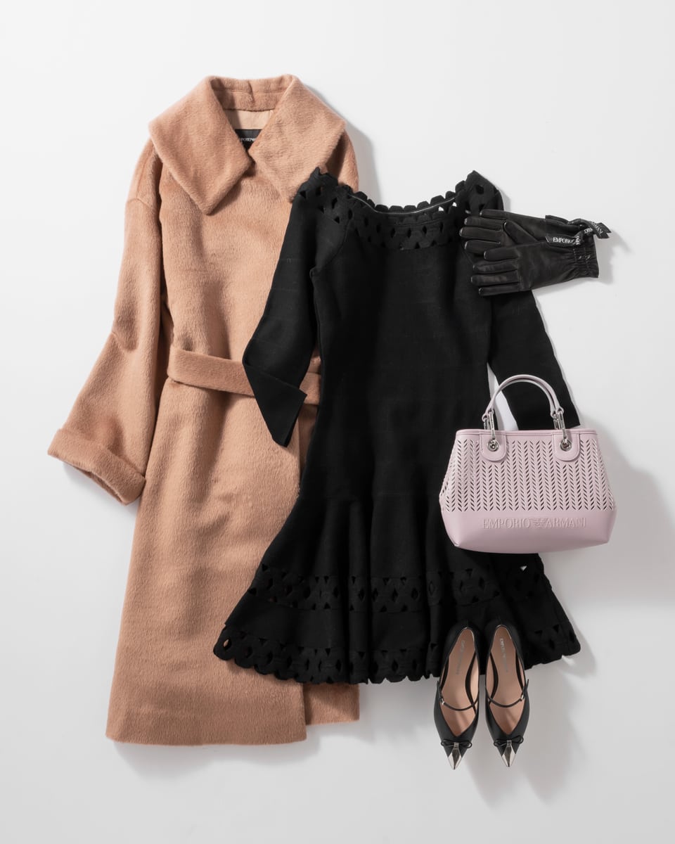 ネックラインと裾のディテールがポイントのブラックドレスに、上品なキャメルのコートを羽織ってデート仕様に。冬の装いを華やかに仕上げてくれるのは、優しいピンクの「MyEA」。シェブロンモチーフのカットや、エンボス加工されたロゴのさりげない存在感も洒落て見える秘訣です。