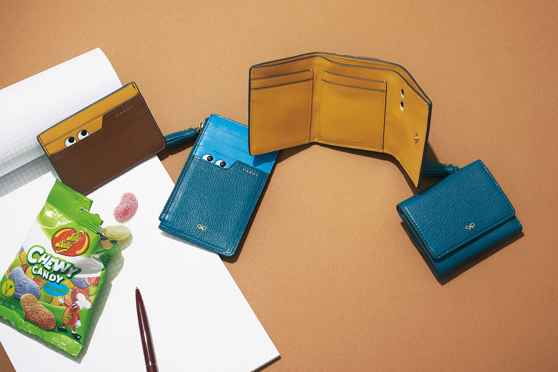小さいながら充実した収納スペースで機能性抜群。さりげなく施されたふたつの瞳がひょっこり現れます。右から財布〈H7.8×W9.4×D3.5〉各¥41,800※同デザイン ジップカードケース〈H8×W13×D1〉¥28,600カードケース〈H7×W10.5〉¥24,200(すべてアニヤ・ハインドマーチ/アニヤ・ハインドマーチ ジャパン)
