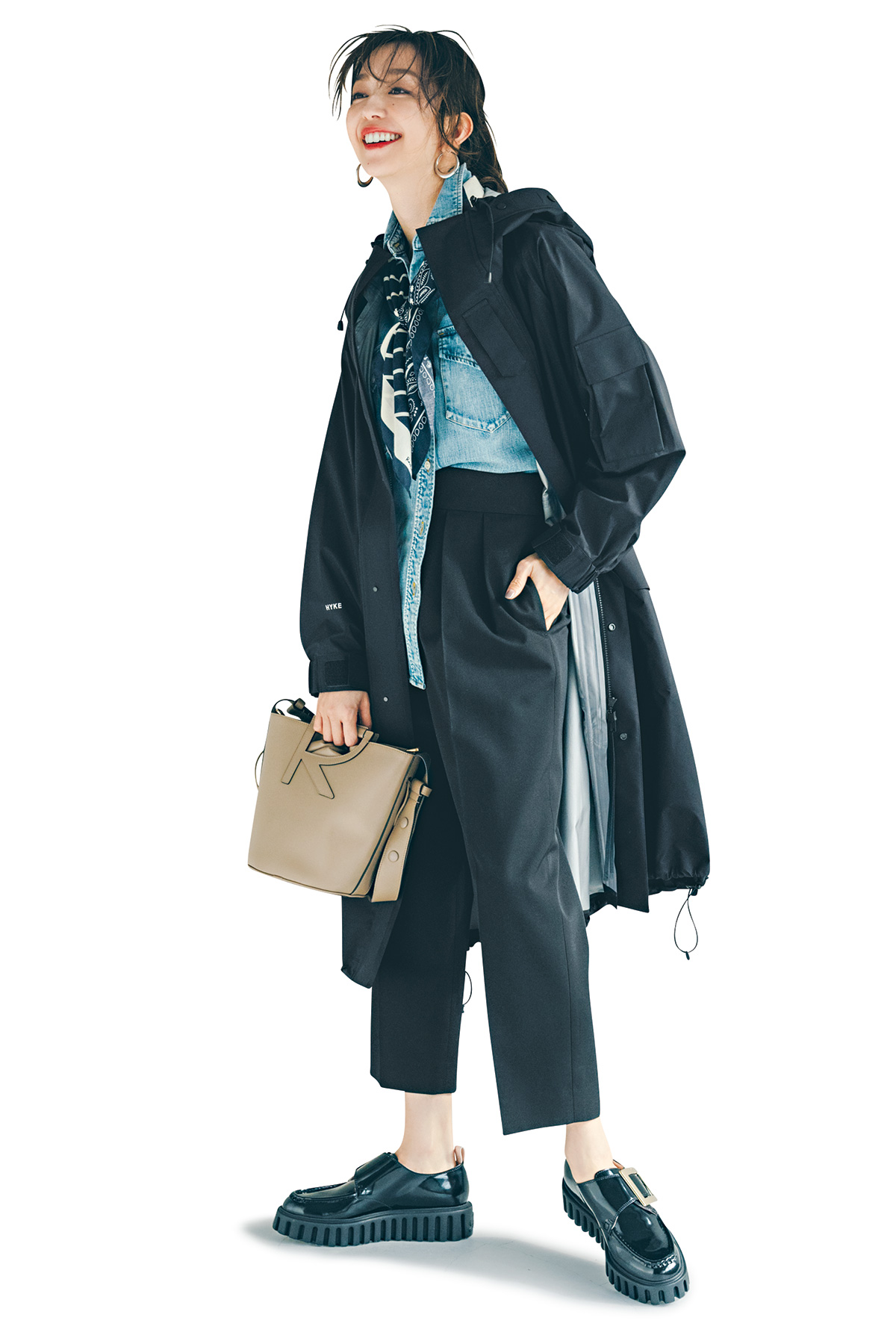 「ウール系の黒アウターは重厚感がありますよね。光沢のあるモッズコートなら、重ね着が増える冬もずっしり重く見える心配がありません。ベージュやカーキと比べて、黒はキレイめで街仕様に仕上がるメリットも」(荒木さん)コート¥105,600(ハイク/ボウルズ)シャツ¥29,700(THIRD MAGAZINE)パンツ¥26,400(ユナイテッドアローズ/ユナイテッドアローズ六本木ヒルズ店)バッグ¥322,300シューズ¥154,000(ともにロジェ ヴィヴィエ/ロジェ・ヴィヴィエ・ジャパン)スカーフ¥17,600(ロウタス/ロウタス カスタマーサービス)ピアス¥5,250(アビステ)