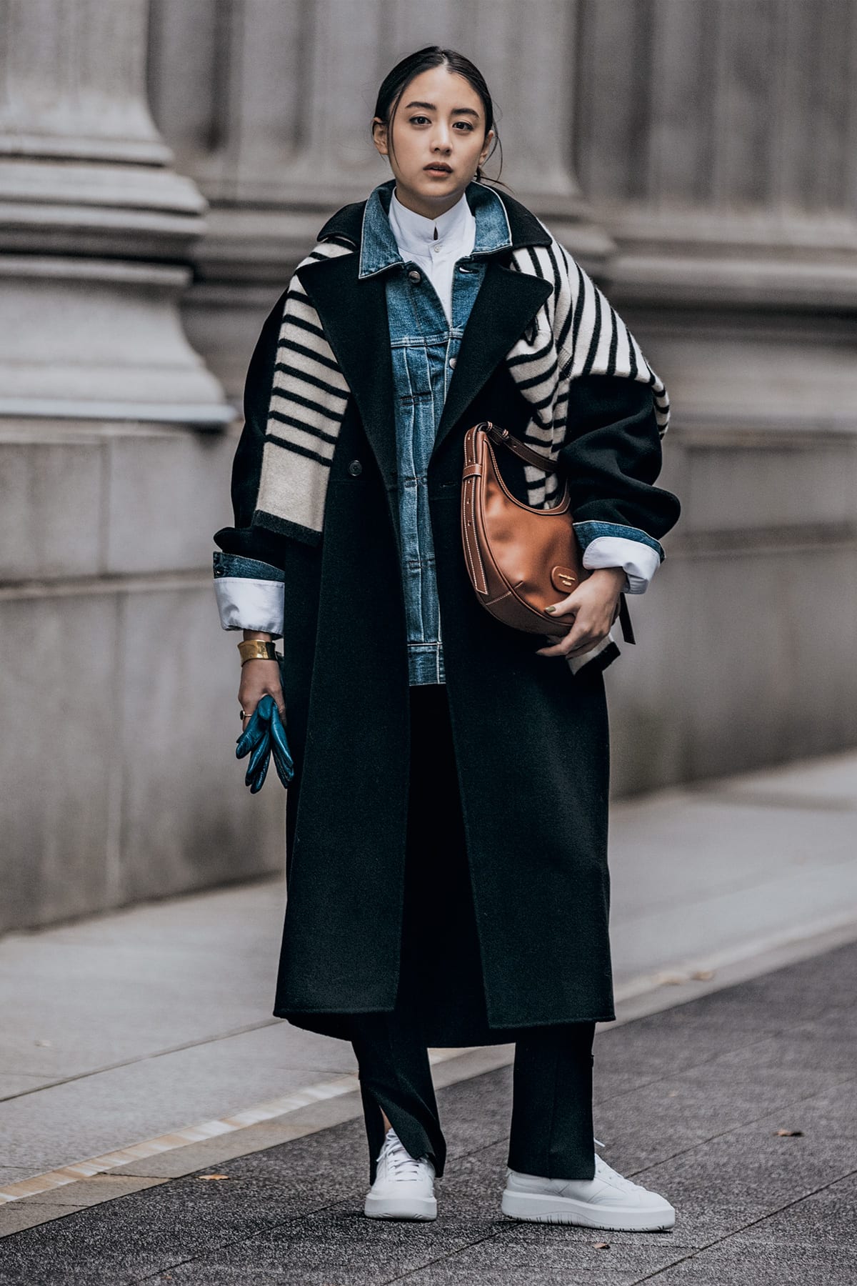ゆったりAラインに後ろプリーツ、シンプルながら計算されたデザイン。コート¥52,800(カレンソロジー/カレンソロジー 青山)デニムジャケット¥41,800(ハイク/ボウルズ)シャツ¥48,400(ブーリエンヌ/エスケーパーズオンライン)ニット¥46,200(アダワス/ショールーム セッション)パンツ¥26,400(デパリエ/デパリエ ニュウマン新宿店)バッグ¥24,200(サマンサタバサ/サマンサタバサルミネ新宿店)靴¥12,980(ニューバランス/ニューバランス ジャパンお客様相談室)グローブ¥12,100(アンタイトル)バングル¥55,000(シンパシーオブ ソウル スタイル/フラッパーズ)リング¥81,400(ココシュニック)