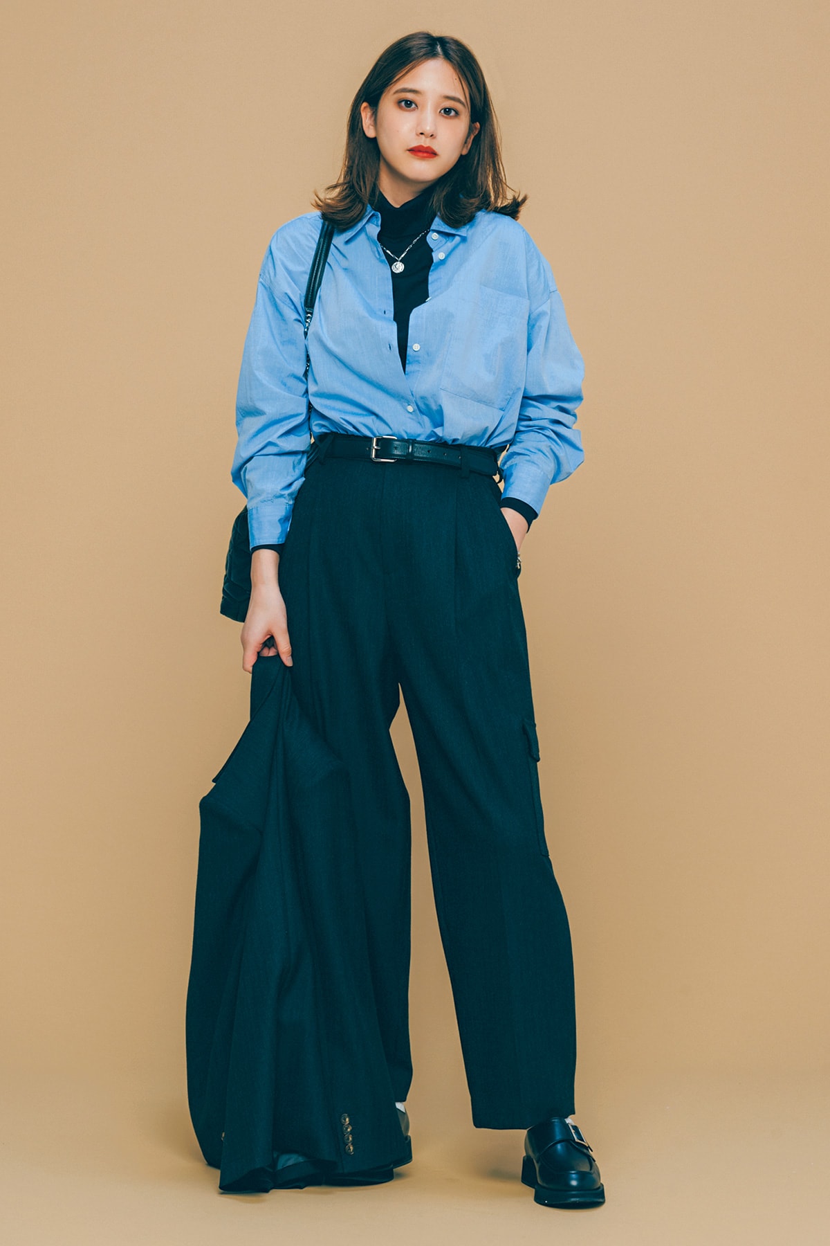 シャツ¥13,200(スピック&スパン/スピック&スパン ルミネ有楽町店)ジャケット¥35,200 パンツ¥24,200 ソックス¥2,090(すべてビューティ&ユース/ビューティ&ユース ユナイテッドアローズ丸の内店)タートルニット¥36,300(スローン)ベルト¥19,800(メゾンボワネ/デミルクス ビームス新宿)コインネックレス¥25,300(マリハ)ブレスレット¥53,900(リューク)シューズ¥29,700 (銀座かねまつ/銀座かねまつ6丁目本店)バッグ¥145,200(ピエール アルディ/ピエール アルディ東京)