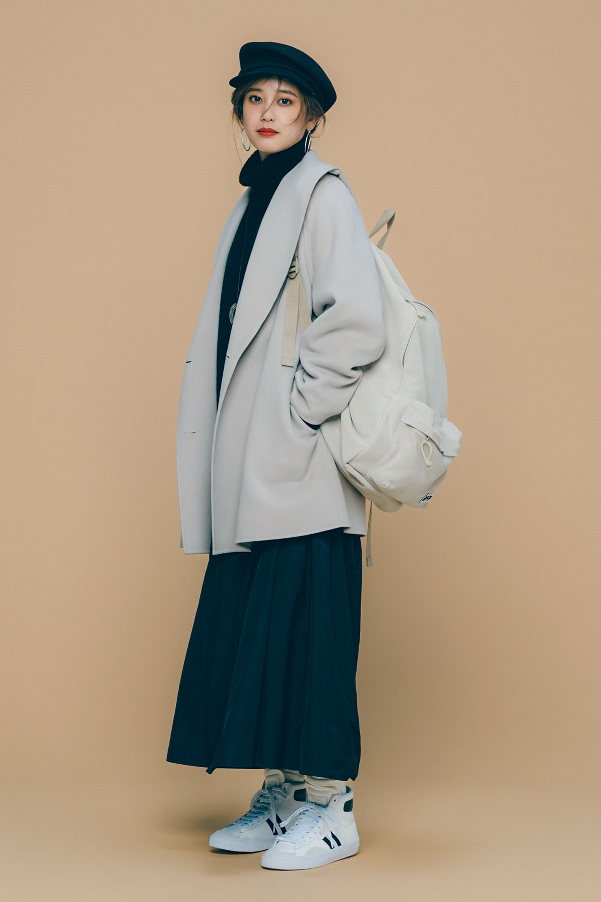ピーコートとリバーコートのいいとこどりしたような、ダブルボタンのベージュのコート。ロングスカートはすっぽり覆うのがベスト、と信じていた人にこそ試してほしい、抜け感と軽やかな新鮮バランスが持ち味です。コート¥85,800(ウィムガゼット/ウィムガゼット ルミネ新宿店)ニット¥95,700(エイトン/エイトン青山)スカート¥15,400(スピック&スパン/スピック&スパン ルミネ有楽町店)ハット¥13,200(CA4LA/CA4LAプレスルーム)ソックス¥2,090(ビューティ&ユース/ビューティ&ユース ユナイテッドアローズ丸の内店)ネックレス¥24,200(アダワットトゥアレグ)ピアス¥31,900(マリハ)スニーカー¥15,400(ポロ ラルフローレン/ラルフローレン)バックパック¥27,500(THIRD MAGAZINE×OUTDOOR PRODUCTS/THIRD MAGAZINE)