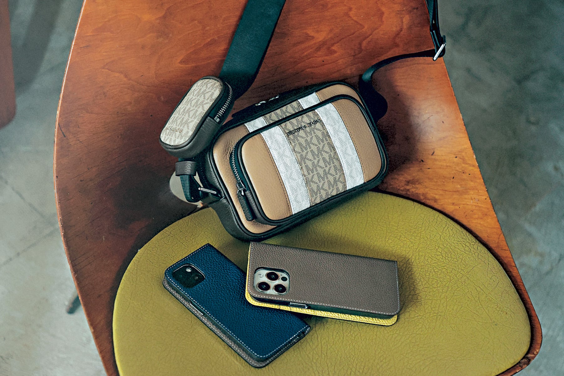 上質な牛革を使用。スナップ式で取り外せるミニポーチにはイヤホンを。バッグ〈H13×W20.5×D5㎝〉¥50,600(マイケル・コース メンズ/マイケル・コース カスタマーサービス)