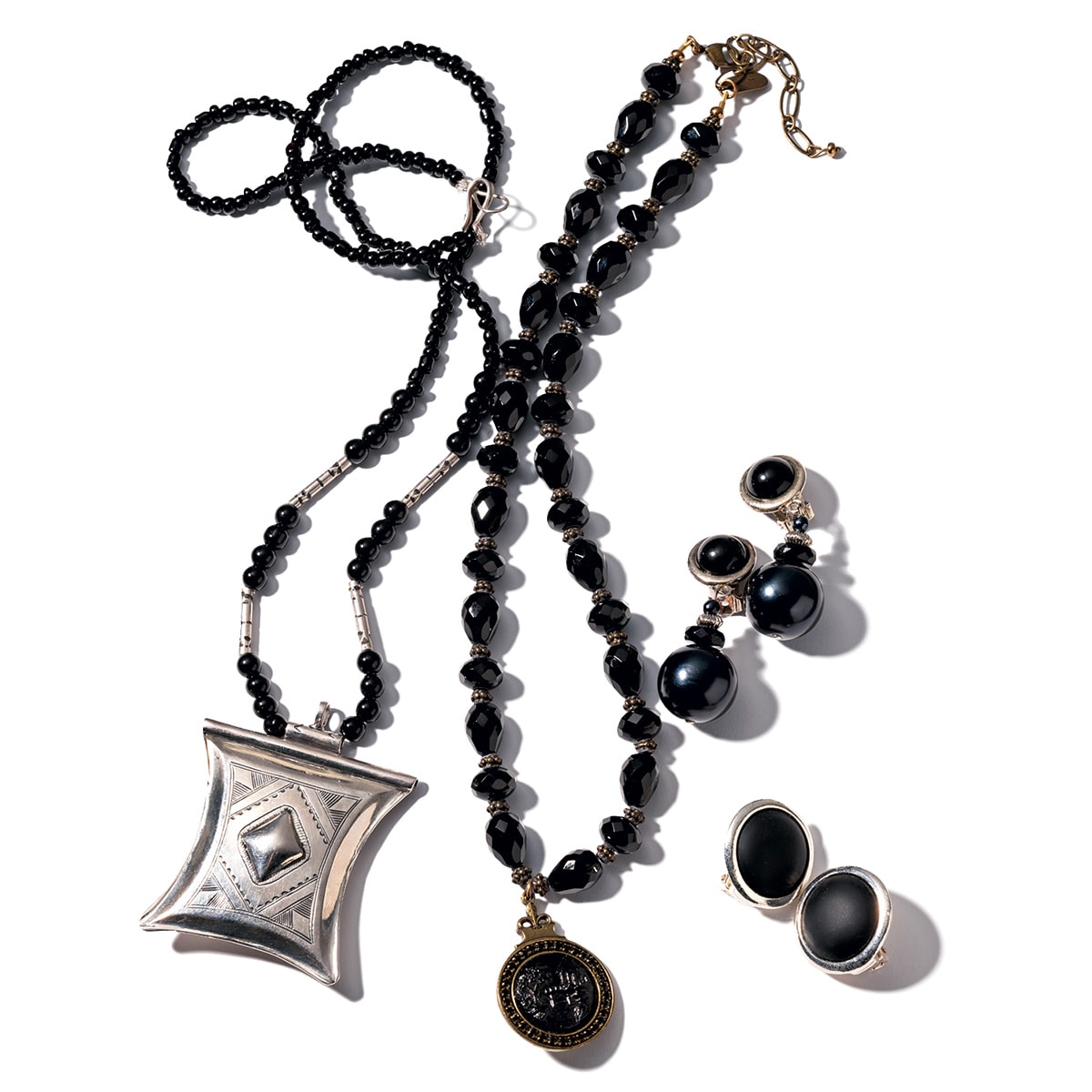 「ゴールドだとエレガントすぎる、シルバーだと強すぎる、そんなときちょうどいいのが黒アクセ。私自身もよく使います。幼く見えがちな色物の洋服も、大ぶりの黒アクセで引き締まります」(荒木さん)【右上】イヤリング¥4,200【右下】イヤリング¥15,120【中】ネックレス¥23,100(すべてアビステ)【左】ネックレス¥42,900(アダワットトゥアレグ)