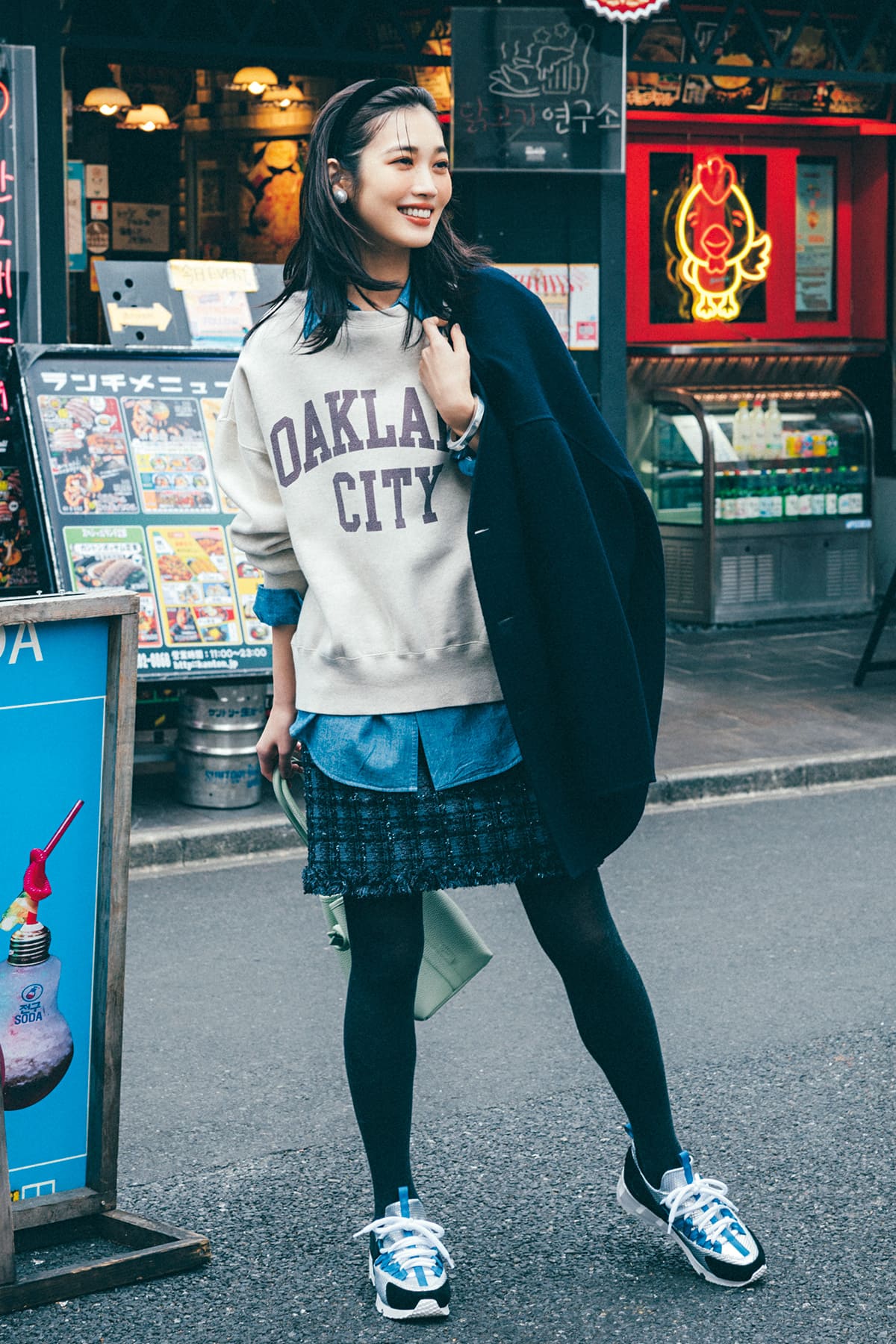 雑多感を楽しむ街で、あえてのキレイめミニ。スウェットやスニーカーといったカジュアルアイテムで、ツイードという女らしい雰囲気をほどよく引き算。
