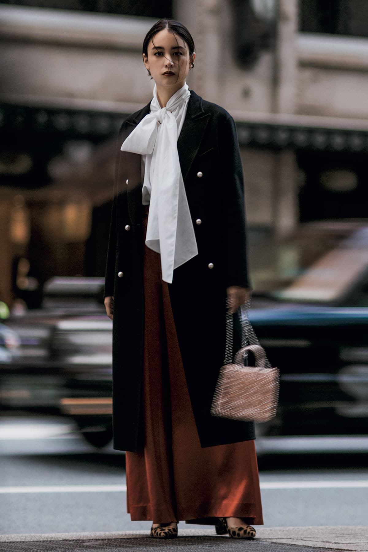 ウエスト位置を低めに設定、腰に引っ掛けてボタンを留めるようなイメージで仕立てられた一着。緻密に計算されたシルエットでエレガントを満喫できます。コート¥195,800(マディソンブルー)シャツ¥41,800(ANAYI)パンツ¥48,400(バナナ・リパブリック)バッグ¥34,100(アンテプリマ/ワイヤーバッグ/アンテプリマジャパン)靴¥35,200(ピッピシック/ベイジュ)イヤーカフ¥29,700※2個セット価格(シンパシーオブ ソウル スタイル/フラッパーズ)