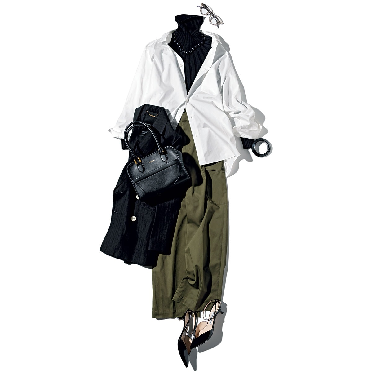 「アイテムや色使いはシンプルですが、レイヤードや黒アクセで断然差がつきます」(荒木さん)ニット¥30,800(レリタージュ/マルティニーク ルコント ルミネ有楽町)シャツ¥31,900(エイトン/エイトン青山)ネックレス¥9,450バングル¥6,090(ともにアビステ)パンツ¥33,000(タンジェント)ジャケット¥51,700(カオス/カオス丸の内)バッグ¥195,800(J&Mデヴィッドソン/J&M デヴィッドソン青山店)シューズ¥53,900(ネブローニ/ウィム ガゼット ルミネ新宿店)メガネ¥80,300(10アイヴァン/アイヴァン PR)