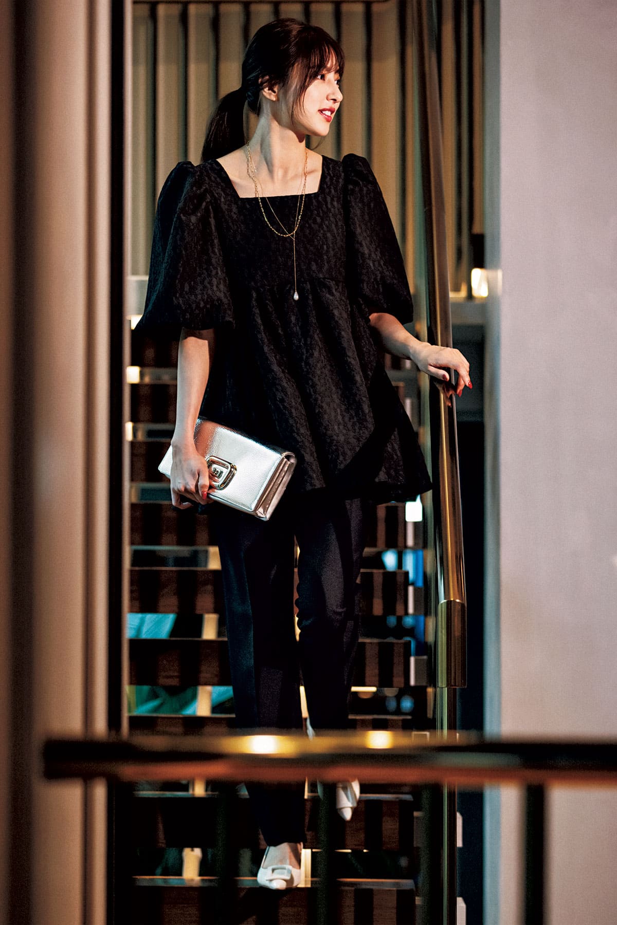 顔映りも完璧なスクエアネックのブラウスには、さらっとまとめたヘアスタイルがバランスよし。ボリューム袖にフレアシルエットとトレンドが詰まっている分、シンプルな黒パンツで上品に。バッグと靴は爽やかな白で、特別な日のムードを盛り上げたい。ブラウス¥25,300(ユー バイ スピック&スパン/ユー バイ スピック&スパン ルミネ新宿店)パンツ¥49,500(ハーヴェルスタジオ/アルアバイル)クラッチバッグ¥407,000パンプス¥116,600(ともにロジェ ヴィヴィエ/ロジェ・ヴィヴィエ・ジャパン)チェーンネックレス¥17,600ロングネックレス¥73,700(ともにマリハ)