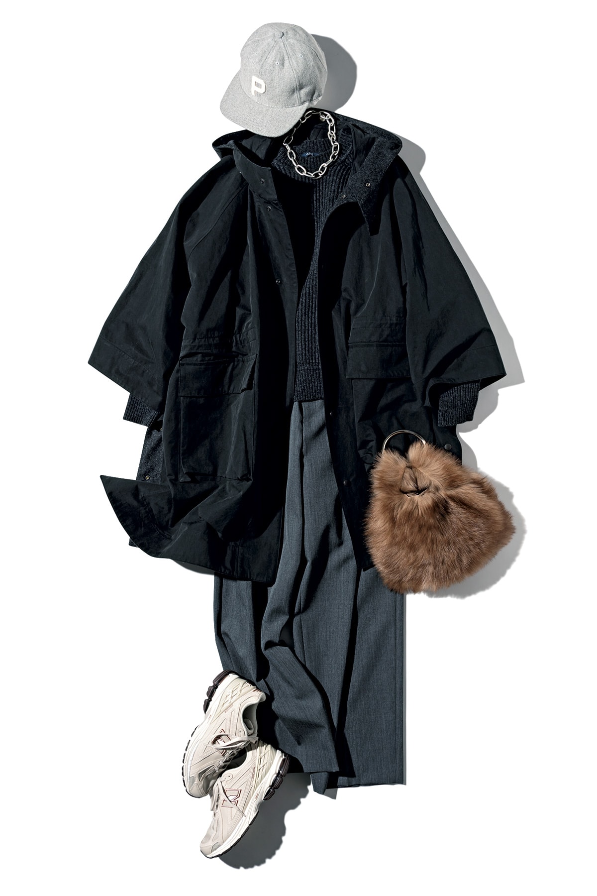 「手堅い黒にちょうどいい抜けを作る、カジュアル素材のアウター。黒×グレーのモノトーンならカジュアルコーデに都会の空気感が」(荒木さん)コート¥74,800ニット¥41,800(ともにイレーヴ)パンツ¥42,900(エイトン/エイトン青山)バッグ¥41,800(カルス/カオス丸の内)スニーカー¥17,600(ニューバランス×ビューティ&ユース/ビューティ&ユース ユナイテッドアローズ丸の内店)キャップ¥8,030(クーパーズタウン/ジャーナル スタンダード自由が丘店)ネックレス¥23,100(ワンエーアールバイウノアエレ/ウノアエレ ジャパン)