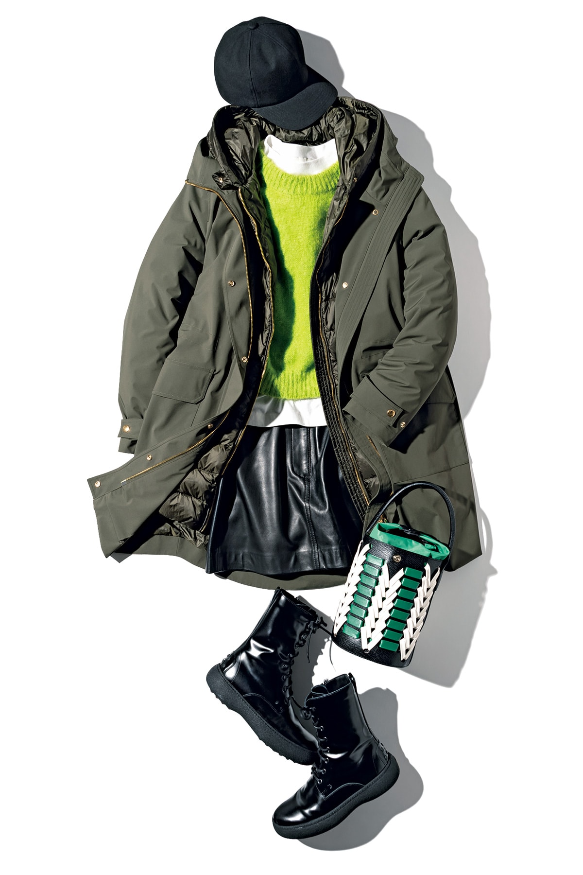 「2割の甘さと8割のメンズっぽさが理想的。メンズライクなアウターと黒のカジュアル小物で、ミニスカをアレンジしています」(乾さん)コート¥119,900(ウールリッチ/スピック&スパン ルミネ有楽町店)ニット¥22,000(マイケルロス/シップス インフォメーションセンター)カットソー¥8,910(アンクレイヴ)スカート¥44,000(THIRD MAGAZINE/THIRD MAGAZINE)キャップ¥8,800(CA4LA/CA4LAプレスルーム)レザーバッグ¥72,600バッグの中に入れたナイロンバッグ¥13,200(ともにロンシャン/ロンシャン・ジャパン)ブーツ¥130,900(トッズ/トッズ・ジャパン)