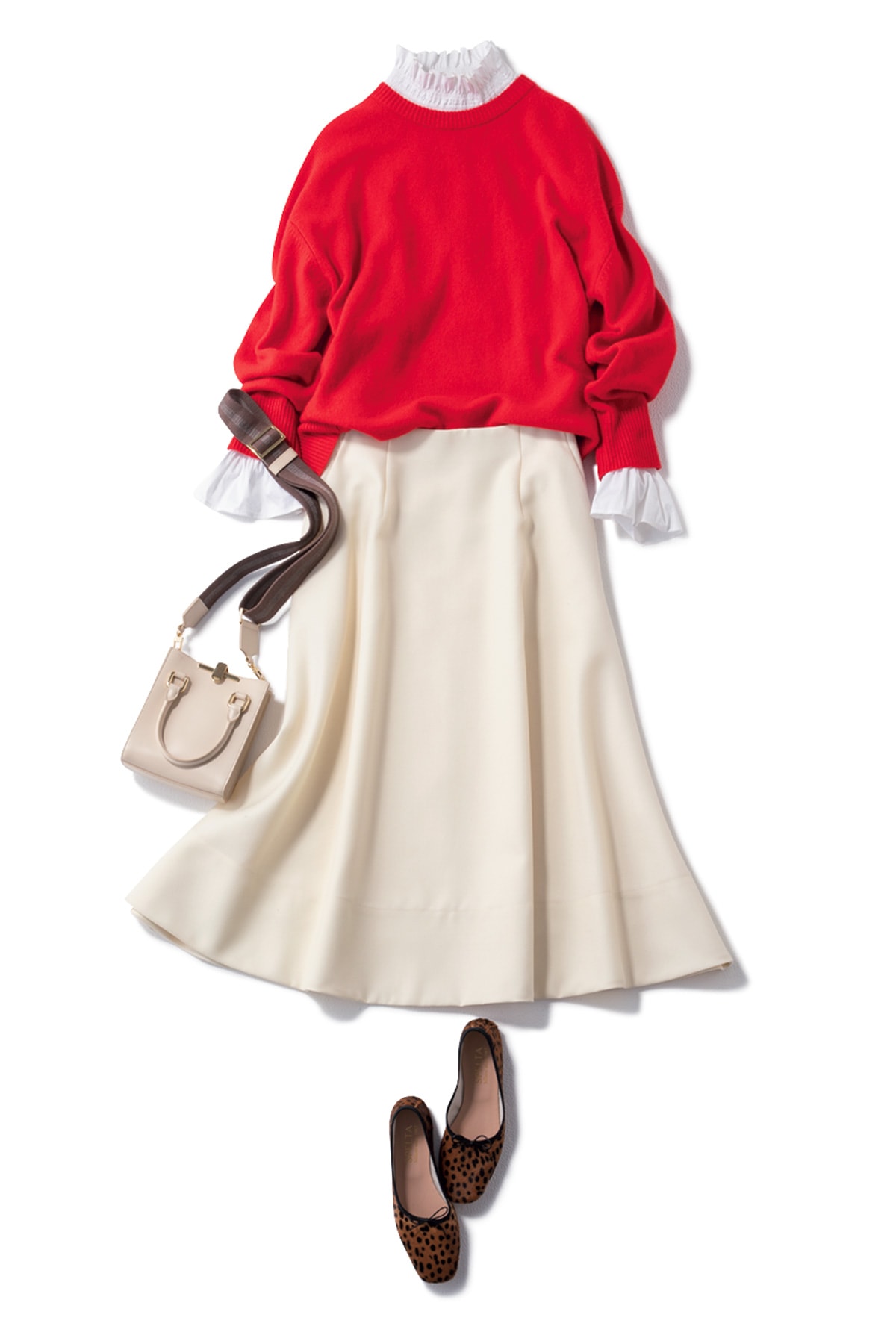 暗くなりがちな冬コーデを明るくオシャレにしてくれる、シンプルな白のフレアスカート¥33,000(エストネーション) -