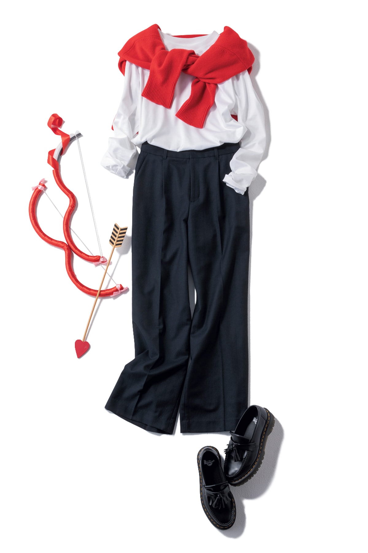 働き女子なら、キリッと見せてくれるきれいめパンツもワードローブに一本お忘れなく。ワイドパンツ¥24,200(アンタイトル) -