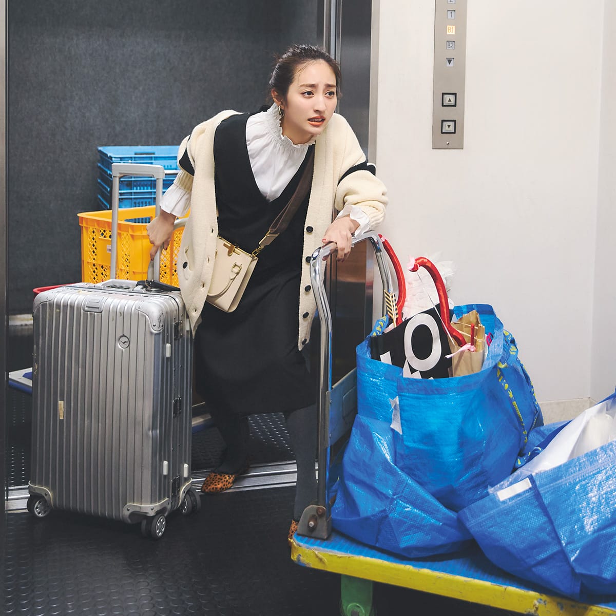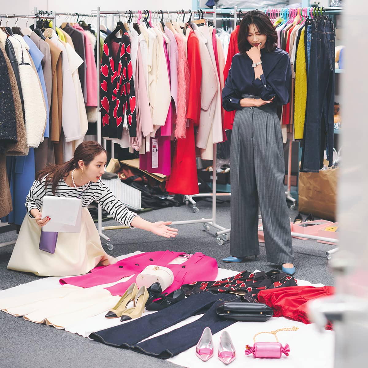 毎回設定やストーリーが独特なCLASSY·の着回しの小道具は大量で、搬入も一苦労!みんな一度はエレベーターの扉に荷物ごと挟まれるらしい…。抜けはないかな?心配で何度もチェック!バッグ¥104,500(ザンケッティ/ウィム ガゼット ルミネ新宿店)シューズ¥36,300(スペルタ/フラッパーズ)イヤカフ¥9,900(ココシュニック)