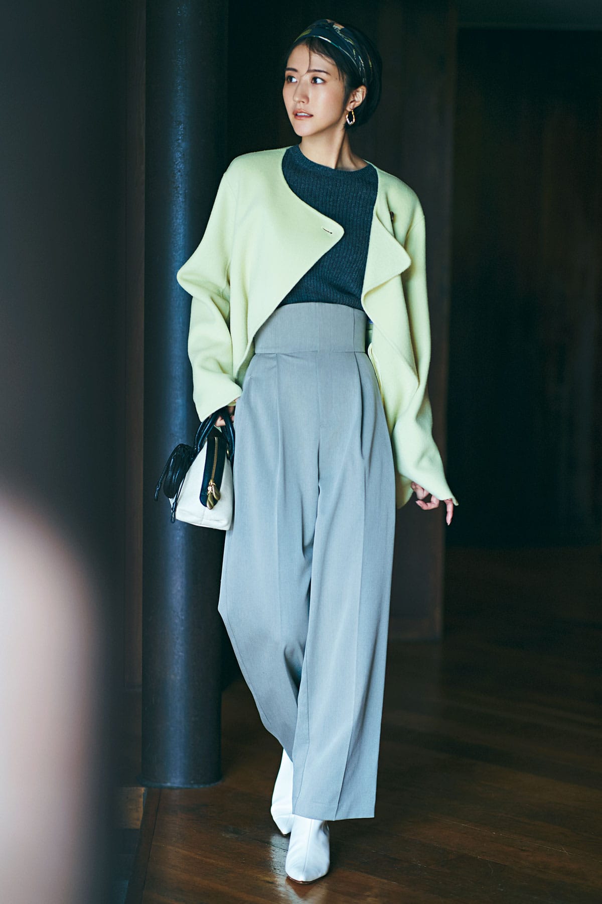 スタイリストからも「とにかくウエストが細く脚長に見える!」と話題の一本。レッグ部分は程よくゆるめで、気になる部分をカバーしながら女らしい美脚に導いてくれます。センタープレスハイウエストパンツ¥8,250(スタイルミキサー/バロックジャパンリミテッド)リブニット¥33,000(ユナイテッドアローズ/ユナイテッドアローズ 六本木ヒルズ店)ショートコート¥47,300(イウエン マトフ/ユナイテッドアローズ 渋谷スクランブルスクエア店)頭に巻いたスカーフ¥14,300(マニプリ)バッグ¥24,200(トフ&ロードストーン/T&L)ブーツ¥41,800(ツル バイ マリコ オイカワ)ピアス¥34,650(ジョアンナ ローラ コンスタンティン/ZUTTOHOLIC)