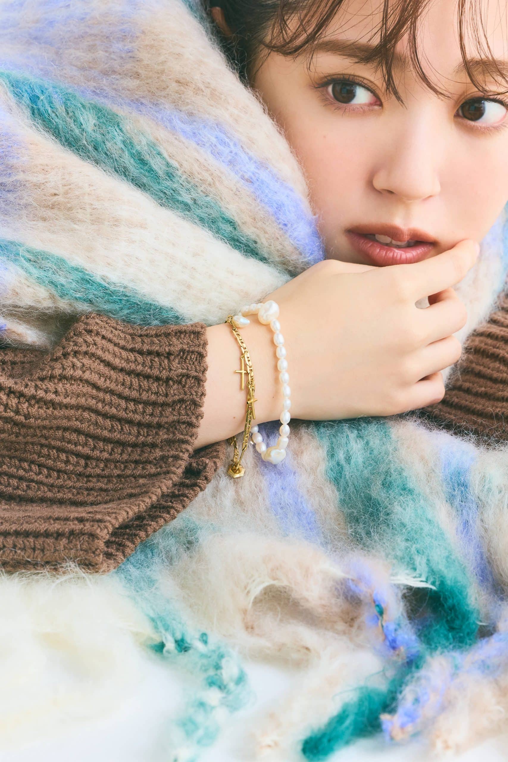 冬とはいえ、視線を集める手元のオシャレ。大小異なるパールを組み合わせたブレスと、クロスチャーム&バロックパールコンビのブレスは、それぞれ単品使いでも存在感大だけど、レイヤードすることで女らしさも華やかさも倍増。ざっくりニットからブレスのじゃら着けをチラ見せして、真冬の着こなしのアクセントに。