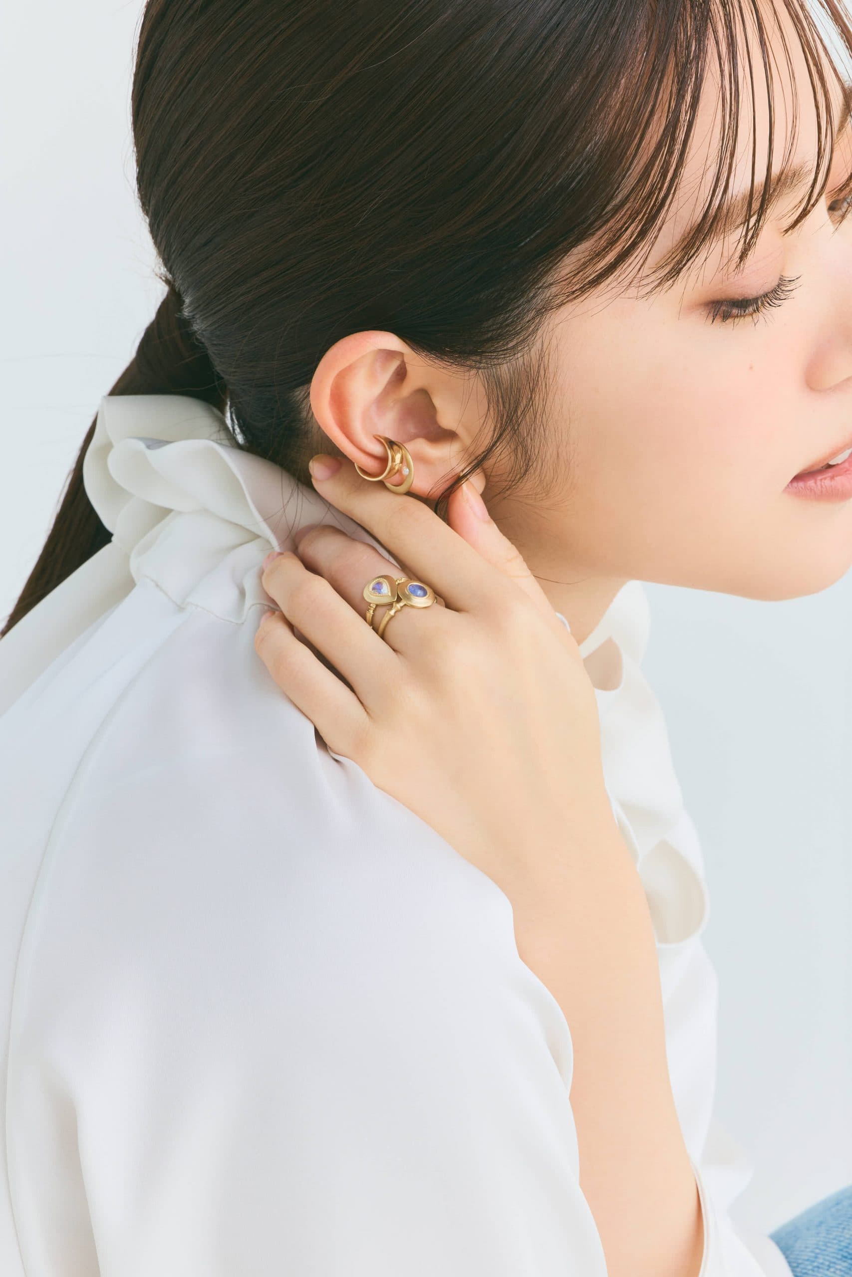 マットな質感のゴールドに色石がセットされたリングは、アンティーク家具からインスピレーションを得たもの。どの角度から見ても美しい立体感にこだわったフォルムで、指先を美しく引き立てるデザイン。ボリューミーなシルエットや一粒パールがあしらわれたイヤカフとセットで着けて、手元と耳元にヴィンテージムード漂うアクセントを。