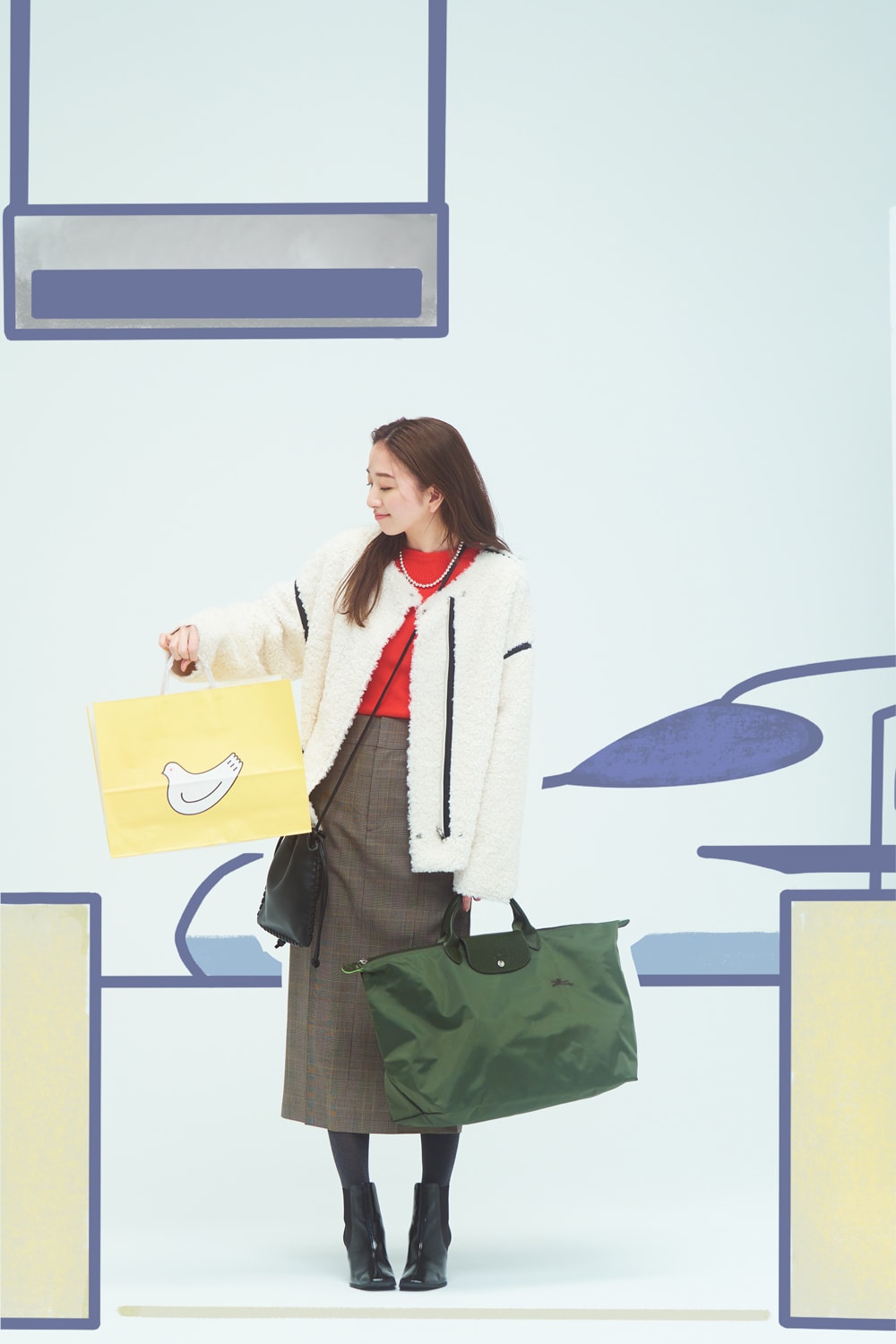 親戚に会ったり、久しぶりに同級生にあったり…イベントが多い年末年始の実家への帰省。手を抜きがちなイベントですが、パリの老舗ブランド「ロンシャン」の定番バッグなら、上品なムードの演出役に適任。フォーマル感が出にくいカーキを選べば、軽やかさとシックな印象を両立。オンオフ問わず活躍します。バッグやスカートをベーシックカラーでまとめれば、ボアジャケットやビビッドカラーがほどよいアクセントになって、メリハリのある落ち着いた雰囲気のコーデに。