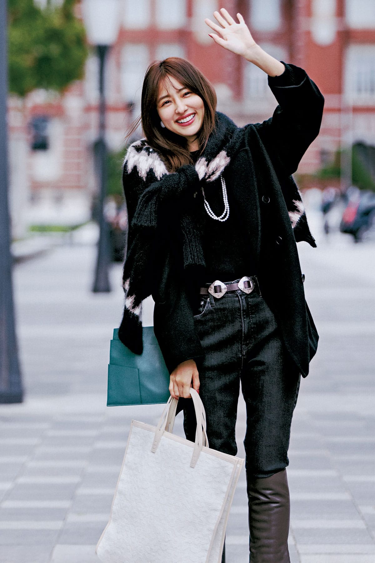 厚手のニットをあえて肩がけして変化をつけつつ、意外性のあるアクセサリーやコンチョベルトでアクセントを。肩にかけたニット¥35,200(バトナー フォー ユナイテッドアローズ/ユナイテッドアローズ 六本木ヒルズ店)コート¥79,200(リジエール/アパルトモン 青山店)ニット¥39,600(エイトン/エイトン青山)デニムパンツ¥23,100(レッドカード トーキョー/ゲストリスト)ベルト¥28,600[参考価格](アトリエ アンボワーズ/アマン)ショルダーバッグ¥16,830〈ノマディス〉トートバッグ¥68,200〈ア ヴァケーション〉(ともにノーベルバ)ブーツ¥71,500(ピッピシック/ベイジュ)イヤリング¥5,250ネックレス¥14,040(ともにアビステ)