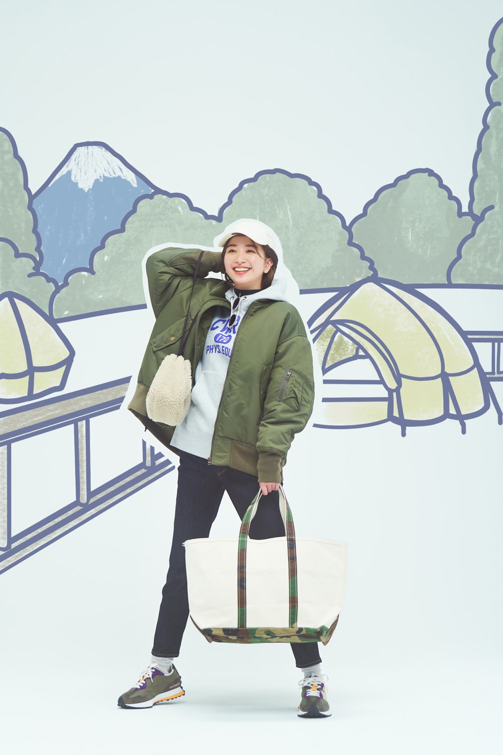 バッグ[H34×W58×D22]¥10,890(L.L.Bean/L.L.Beanカスタマーサービスセンター)ブルゾン¥52,800(ウーア/ジャーナル スタンダード レサージュ 銀座店)スウェット¥10,800(チャンピオン/ヘインズ ブランズ ジャパン カスタマーセンター)ニット¥19,800パンツ¥28,600(ともにヤヌーク/カイタックインターナショナル)巾着バッグ¥4,950(ケルティ/アリガインターナショナル)スニーカー¥13,090(ニューバランス/ニューバランスジャパンお客様相談室)キャップ¥5,280(マイカ アンド ディール/マイカ アンド ディール 恵比寿本店)