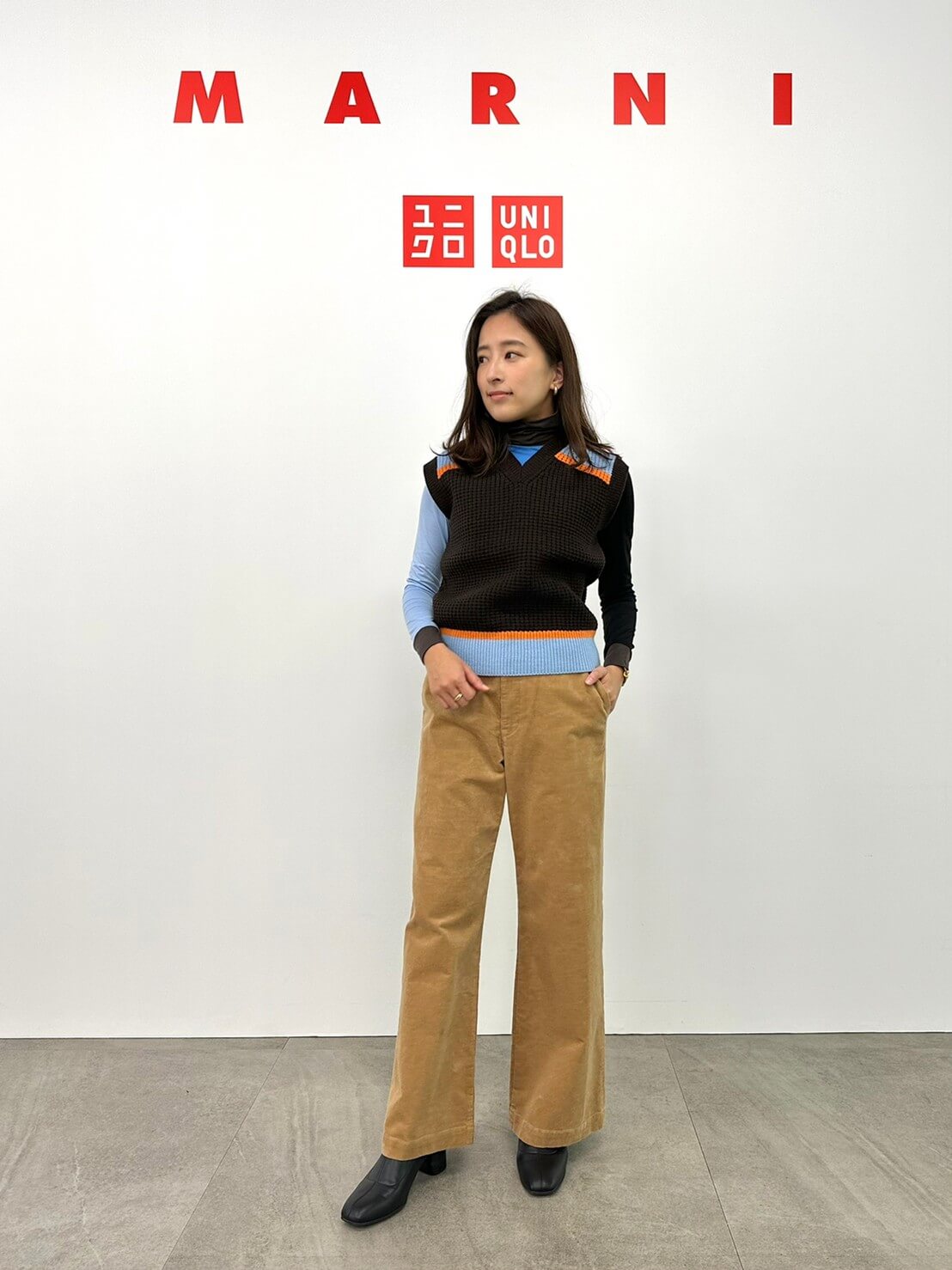 ポップコーンニットVネックベスト¥1,290 ※限定価格[Mサイズ着用]ヒートテックタートルネックT(長袖)¥1,990[Mサイズ着用](ともにUNIQLO and MARNI/ユニクロ)コーデュロイワイドパンツ(丈標準69~71cm)¥2,990(値下げ価格)[Mサイズ着用]ストレッチショートブーツ¥4,990(ともにユニクロ)