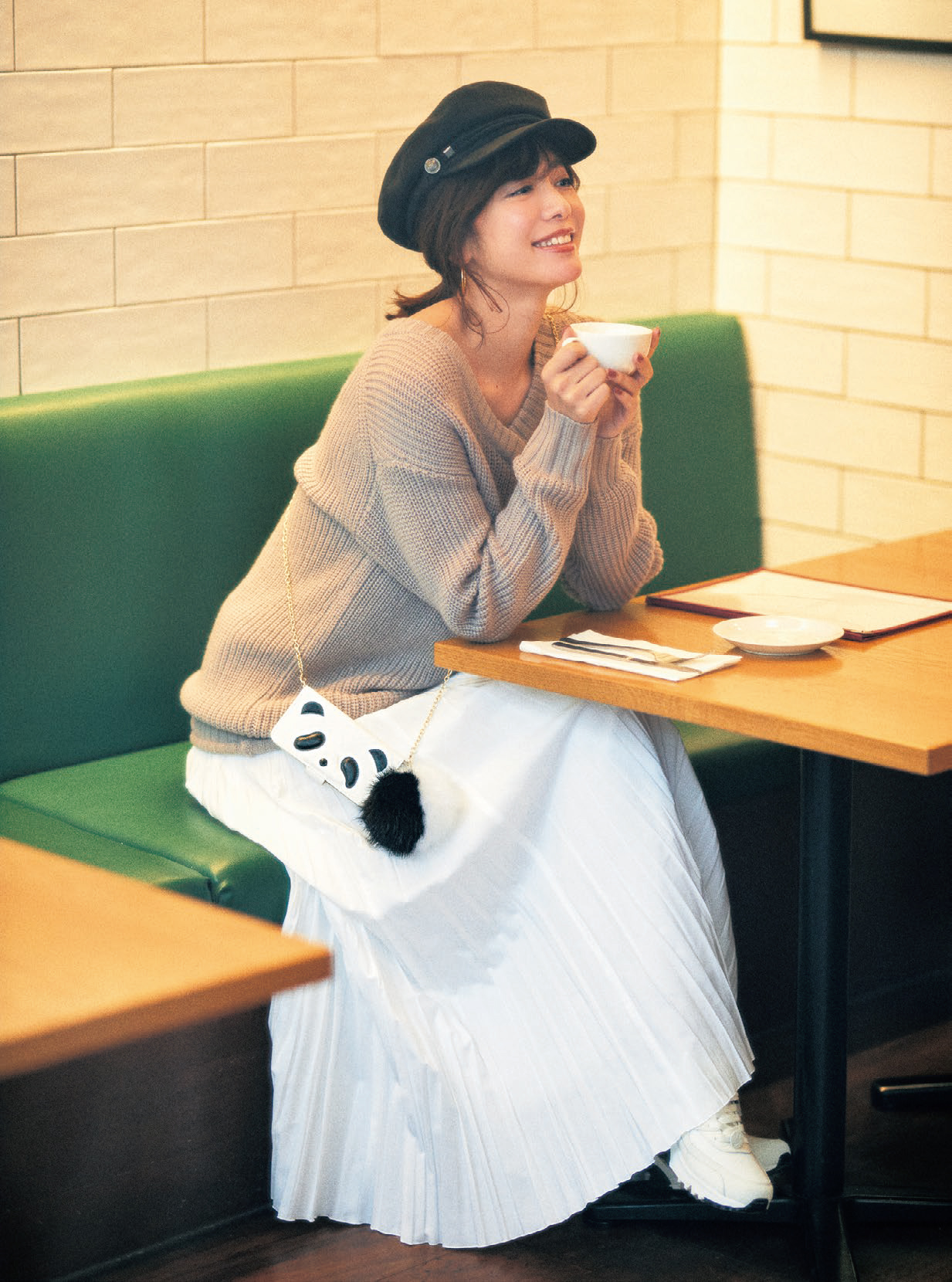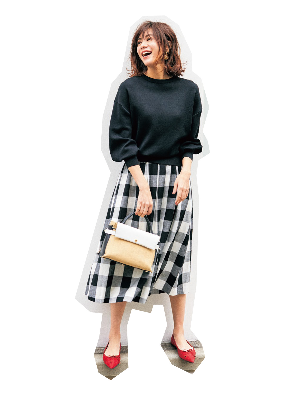 バッグ〈H19×W23×D15〉¥33,000(ポティオール/ショールーム セッション)ニット¥22,000(ハウント/ハウント代官山(ゲストリスト)スカート¥33,000(アイロン×デミルクス ビームス/デミルクス ビームス新宿)パンプス¥26,000(プリティ・バレリーナ/F.E.N.)イヤリング 参考商品(アビステ)
