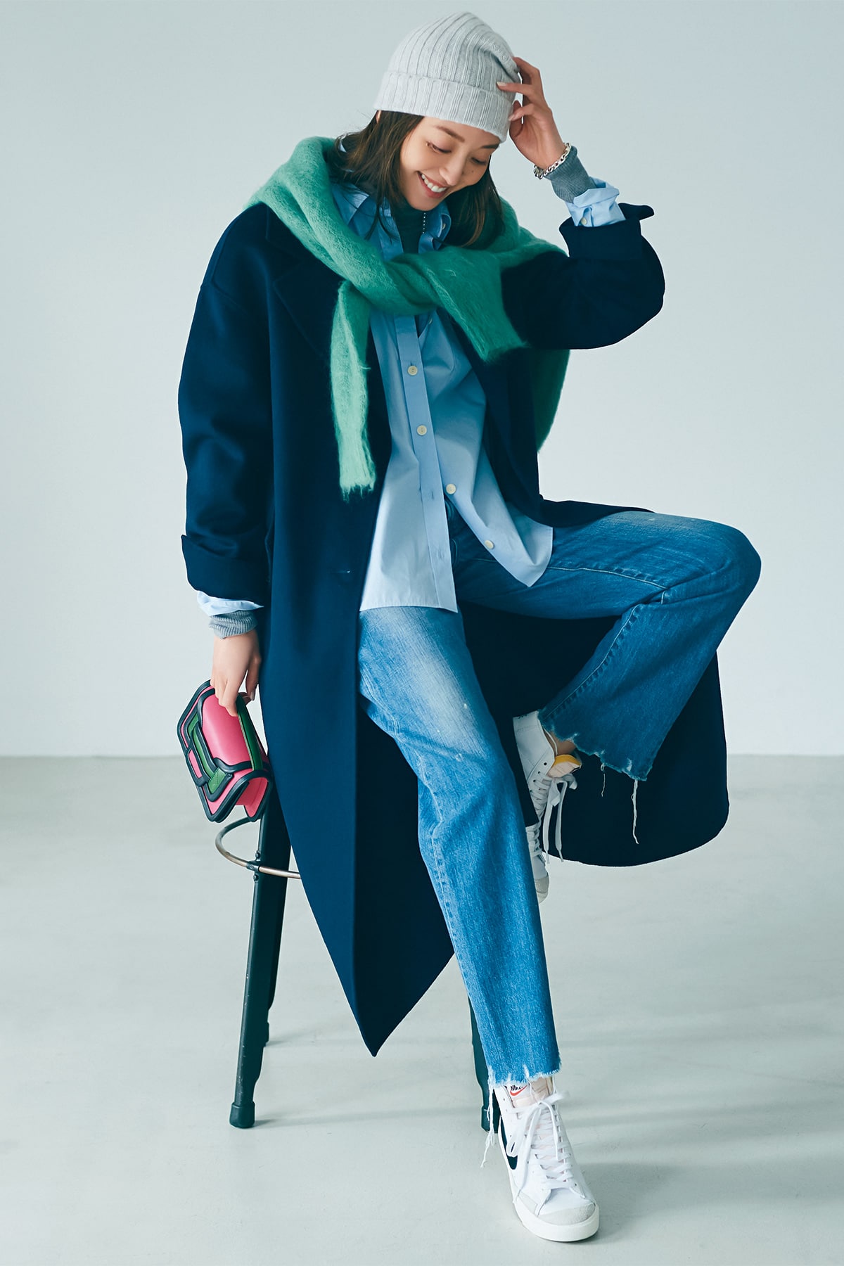 「ハイゲージのタートル、サックスブルーのシャツ、肩にかけたモヘアのニット…異素材のコンビネーションがオシャレ見えのカギ。色みも寒色でまとめればすっきり」(大野さん)コート¥28,400(バナナ・リパブリック)肩にかけたニット¥36,300(スローン)シャツ¥64,900〈マリア マクマヌス〉ニット¥19,800〈アパルトモン〉(ともにアパルトモン 青山店)デニムパンツ¥24,200(レッドカード トーキョー/ゲストリスト)ニット帽¥9,790(ウィリアムブラントン/アルアバイル)バッグ¥102,300(ピエール アルディ/ピエール アルディ 東京)スニーカー¥12,100(ナイキ/プラージュ 代官山店)ブレスレット¥18,900(アビステ)ネックレス¥13,200(イン ムード/フォーティーン ショールーム)