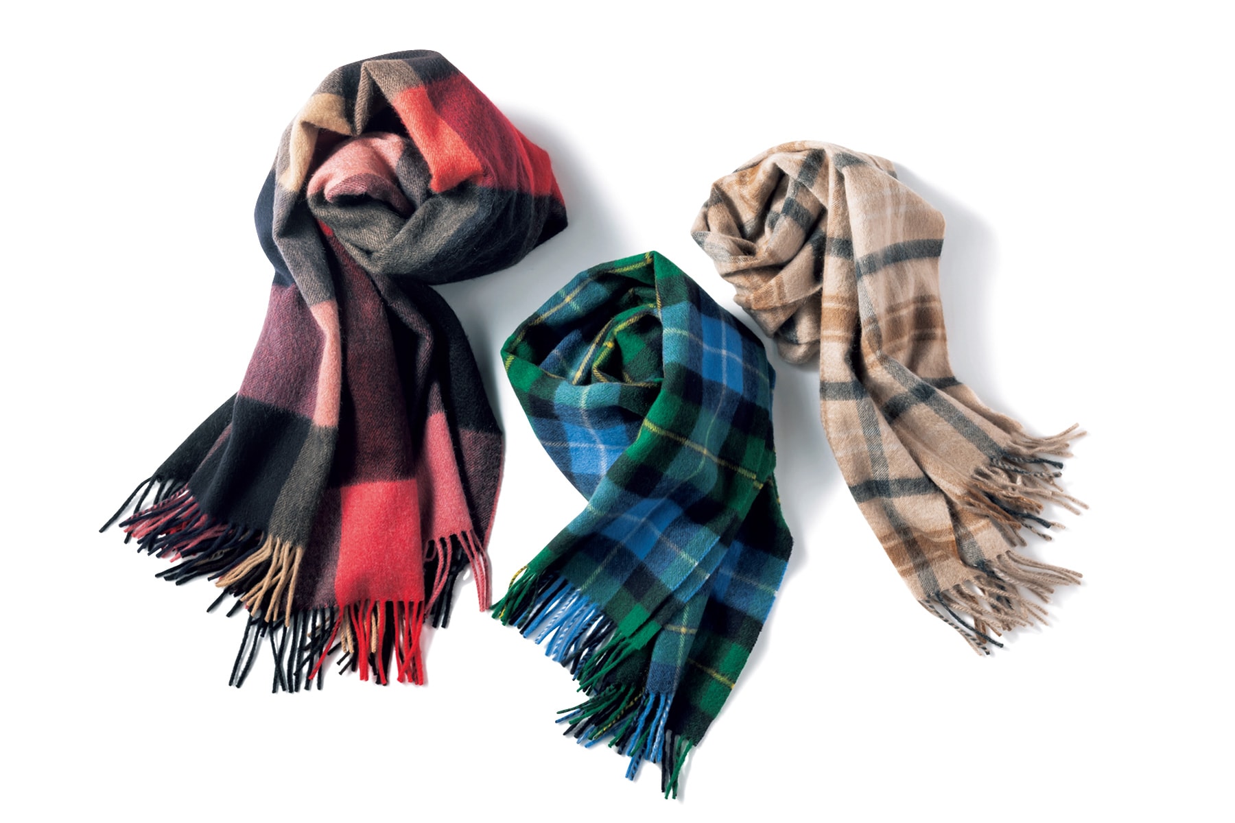 【右】まろやかな女らしさが漂うベージュ系。ストール¥40,700(ベグ アンド コー/ボーダレス)【中】正統派タータンチェック。ブルー×グリーンの鮮やかな配色が、顔周りを華やかに彩ります。ストール¥27,500【左】見た目からも温もりを感じる、ピンク系の大判ストール。ストール¥68,200(ともにジョシュアエリス/グリニッジ ショールーム)