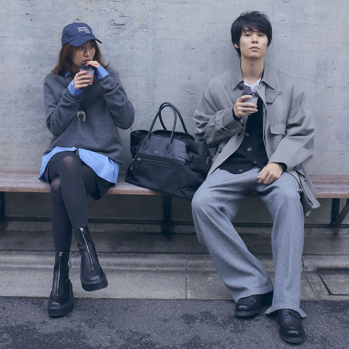 ザ・ロウのシグネチャーである「マルゴー」の、ナイロンキャンバス×レザー製のバッグ。軽くて大容量、中が見えないようちゃんとドローストリングもついているから安心。男女どちらが持ってもしっくりくる、まさに今の気分にぴったりのitバッグ。バッグ「マルゴー 17 インサイドアウト」〈H30.5×W43.2×D25.4〉¥548,900〈MAYUKO〉ブーツ¥247,500(ともにザ・ロウ/ザ・ロウ・ジャパン)ニット¥46,200キャップ¥6,490(ともにSEA/S-STORE)シャツ¥36,300(エイトン/エイトン青山)スカート¥5,990(MANGO/ロコンド)ネックレス¥29,700(アダワットトゥアレグ)リング¥11,660(パズコレクティブ/ZUTTOHOLIC)〈RIKU〉ジャケット¥76,780(エイク/エイクショップ)カーディガン¥96,800(ユーゲン/イデアス)パンツ¥30,800(レインメーカー)シューズ¥79,200 (パラブーツ 青山)カットソー※スタイリスト私物