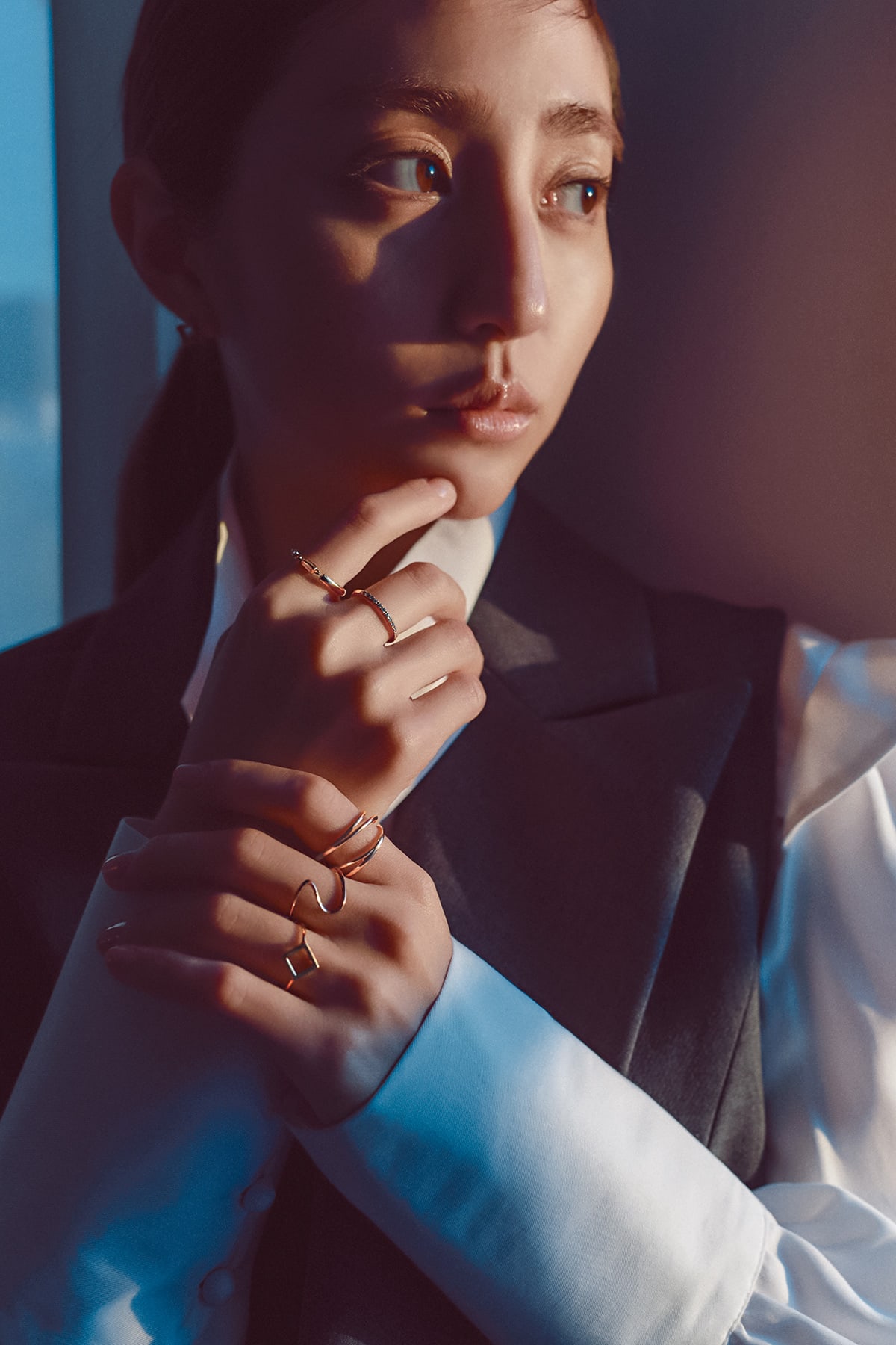 ピアス¥8,800(シズクイロ/フォーティーンショールーム)リング右手人差し指ダイヤモンド付きリング¥104,500(ベルシオラ)中指ダイヤモンドリング¥69,300(アナプノエ/フォーティーン ショールーム)左手人差し指リング¥48,400(スタージュエリー/スタージュエリー表参道ヒルズ店)中指リング¥19,800(NOJESS)薬指リング¥46,200(マリハ)ジレ¥39,000(シーニュ)ブラウス¥22,550(オスカー/JACK of ALL TRADES press room)