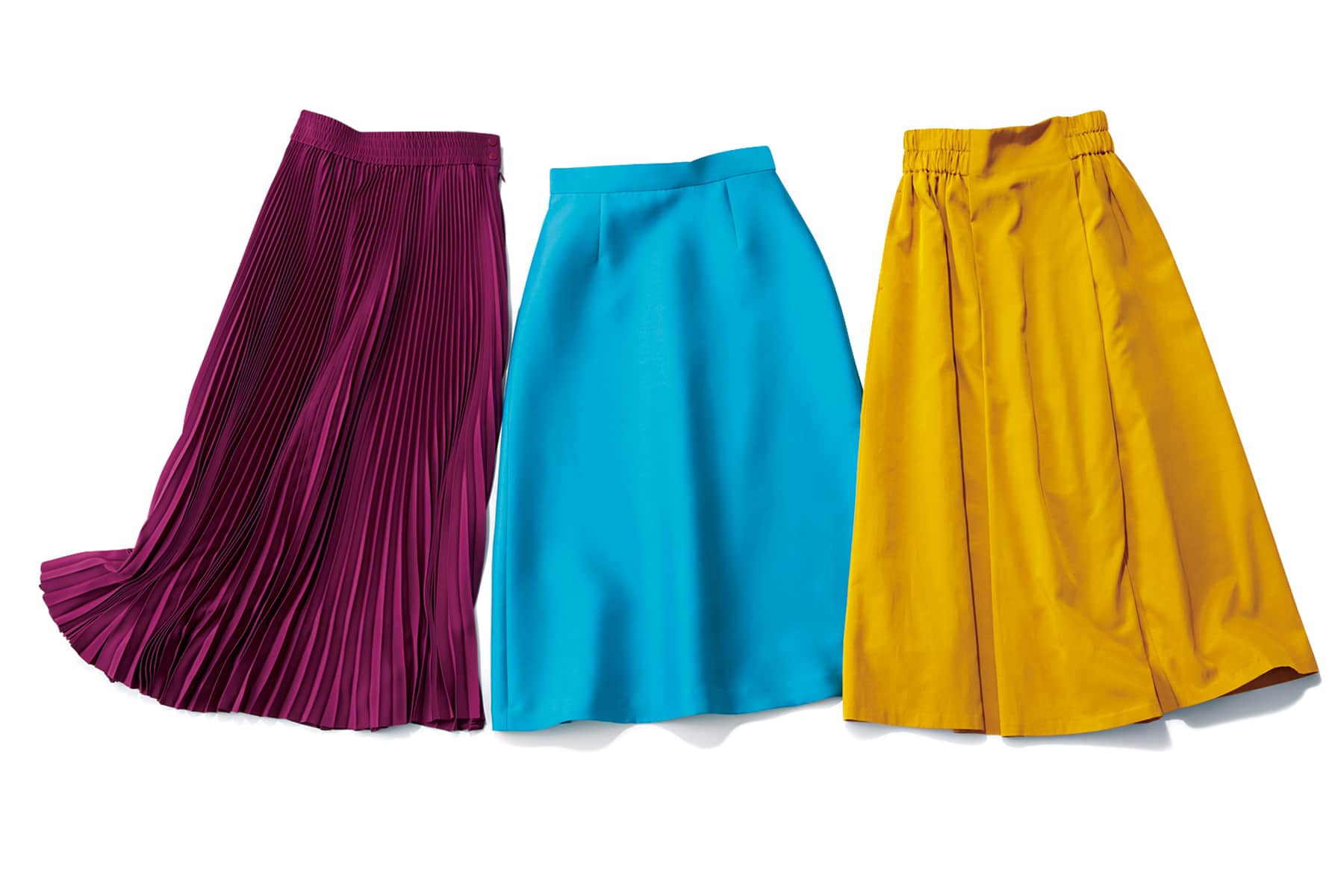 〈右から〉後ろがゴムでノーストレスな穿き心地。スカート¥23,980(アンクレイヴ ホワイト/オンワード樫山)上品な光沢と発色がキレイ。すとんとした台形シルエットが脚をキレイに見せてくれます。スカート¥29,700(ANAYI)歩くたびに優しく揺れる、細めプリーツがエレガント。スカート¥38,500(ハイク/ボウルズ)