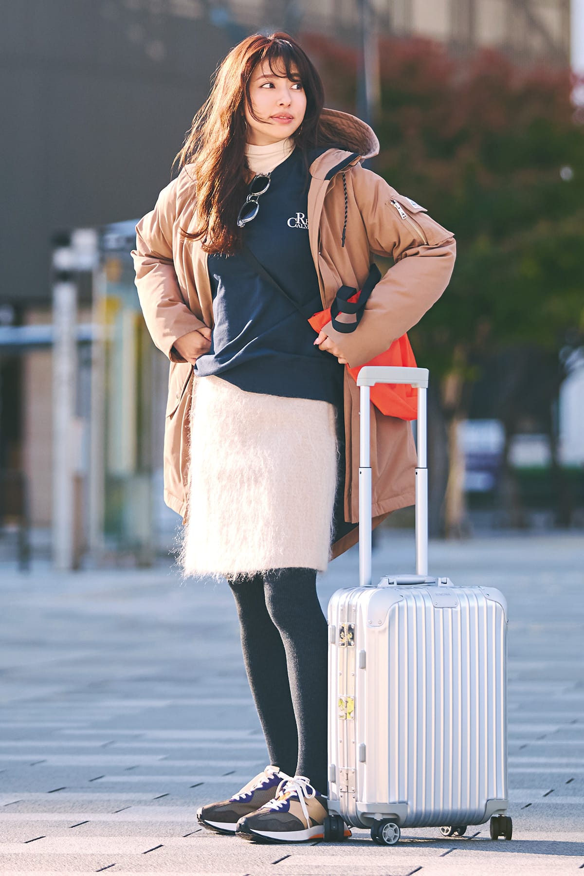スカート¥19,800(FRAY I.D)コート¥68,000(ケープハイツ/グリニッジ ショールーム)スウェット¥14,300[2月上旬入荷予定](アルページュストーリープレスルーム)ニット¥7,500(コス/COS銀座店)バッグ¥6,490(バテンウェア/アリガ インターナショナル)スニーカー¥13,090(ニューバランス/ニューバランス ジャパンお客様相談室)タイツ¥1,430(フランティカ バイ フクスケ/福助)ピアス¥8,400(アビステ)サングラス¥44,000(アイヴァン/アイヴァン 東京ギャラリー)スーツケース¥174,900(リモワ/リモワ クライアントサービス)